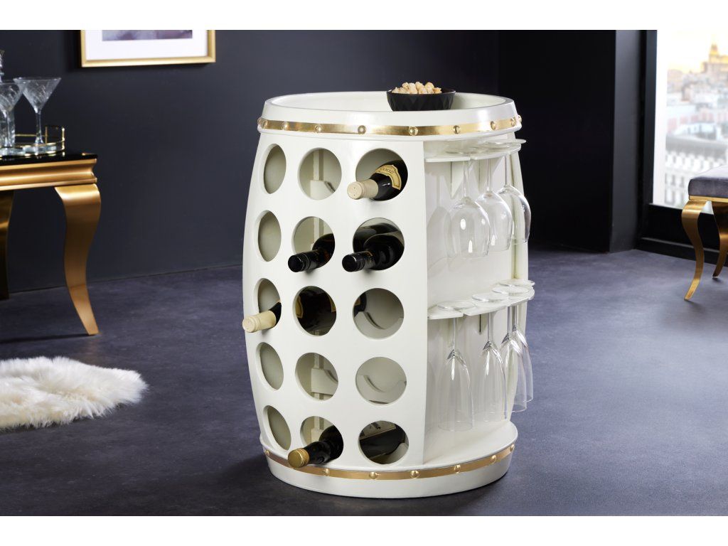 Dřevěná bílá vinotéka Bodega ve tvaru sudu je stylovým barovým kusem nábytku. Stylový a praktický doplněk interiéru. Vinotéka je vyrobena z borovicového dřeva.