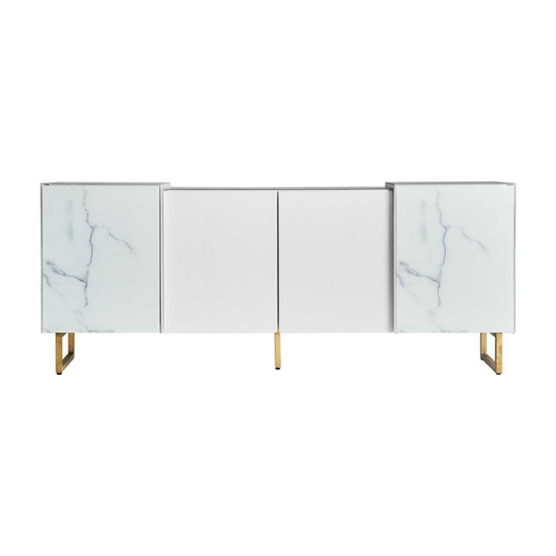 V detailu je viditelné skleněné provedení tohoto designového nábytku Brujo, ať už se jedná o barvu bílou, černou, nebo o dekor bílého mramoru, a jeho propojení s kovovými zlatými součástmi.