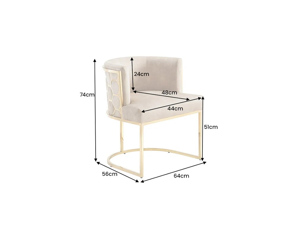 Art-Deco židle Enna Gold kombinuje béžový samet s nápadnými zlatými detaily, čímž vytváří výrazný a přesto nadčasový design. Měkké sametové čalounění poskytuje příjemný komfort při sezení, zatímco konstrukce z nerezové oceli ve zlatém provedení zajišťuje stabilitu a vizuální lehkost. Díky kompaktním rozměrům a pohodlnému sedáku je židle Enna Gold vhodná jako jídelní židle, stylový doplněk do obývacího pokoje i reprezentativní prvek do hotelových či komerčních interiérů.