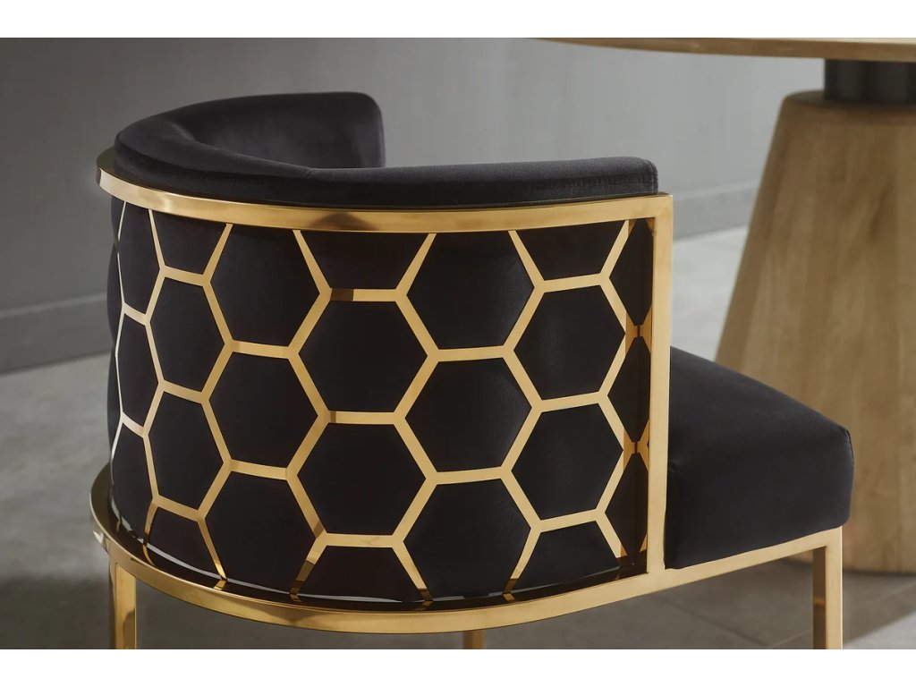 Art-Deco židle Enna Gold kombinuje černý samet s nápadnými zlatými detaily, čímž vytváří výrazný a přesto nadčasový design. Měkké sametové čalounění poskytuje příjemný komfort při sezení, zatímco konstrukce z nerezové oceli ve zlatém provedení zajišťuje stabilitu a vizuální lehkost. Díky kompaktním rozměrům a pohodlnému sedáku je židle Enna Gold vhodná jako jídelní židle, stylový doplněk do obývacího pokoje i reprezentativní prvek do hotelových či komerčních interiérů.
