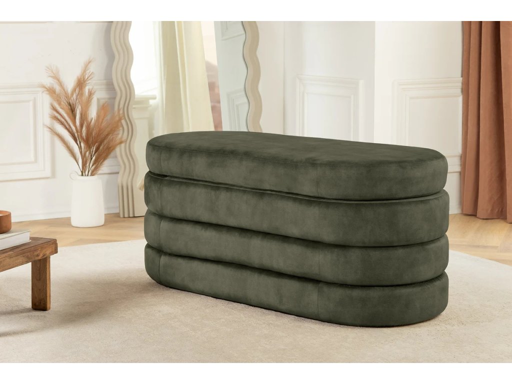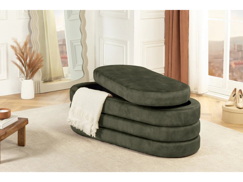 Stylová sametová lavice Voque v elegantní zelené barvě kombinuje moderní design s praktickým využitím. Pod pohodlným sedákem se nachází úložný prostor, ideální pro uložení dek, polštářů nebo jiných drobností. Luxusní sametové čalounění dodává lavici sofistikovaný a nadčasový vzhled, který se hodí do každého moderního interiéru. Lavice nabízí pohodlné sezení a zároveň funkční řešení pro udržení pořádku v prostoru.