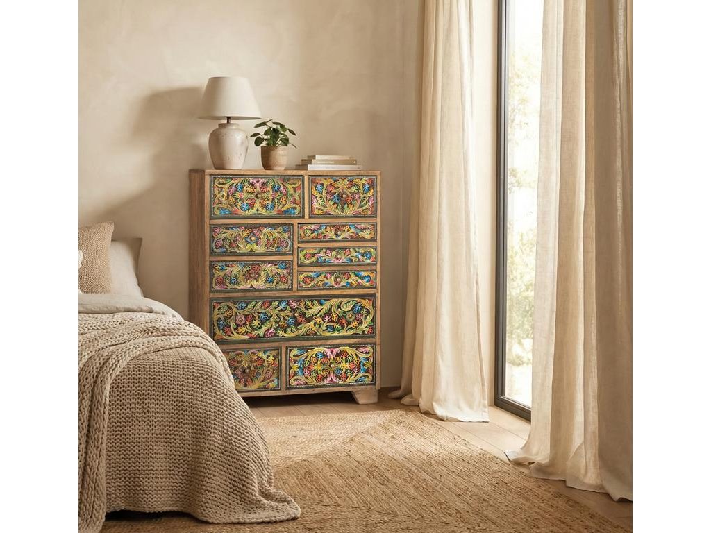 Tato kouzelná komoda z kolekce Java spojuje tradiční umění s maximální funkčností. Nabízí velkorysý a organizovaný úložný prostor ukrytý v deseti zásuvkách, jejichž čelní plochy zdobí detailní květinové ornamenty. Korpus v přírodním odstínu nechává krásně vyniknout přirozenou kresbu mangového dřeva. Díky kompaktnímu provedení se skvěle hodí do obývacího pokoje, ložnice i předsíně, kde zazáří jako výrazný designový solitér.