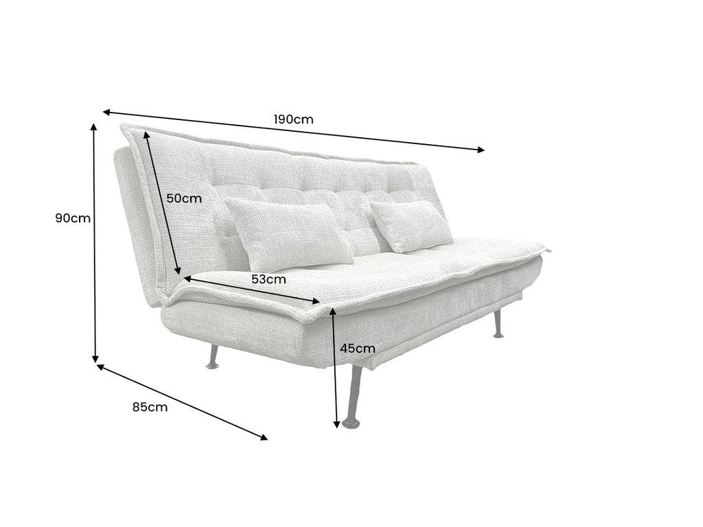 Moderní rozkládací pohovka Limpiara v barvě champagne beige přináší do interiéru klidnou eleganci a moderní pohodlí. Jemné žinylkové čalounění je měkké na dotek a dodává pohovce luxusní vzhled, zatímco kvalitní pěnové polstrování zajišťuje komfort při každodenním sezení i relaxaci. Díky jednoduchému rozkládacímu mechanismu se pohovka snadno promění v prostorné lůžko pro příležitostné přespání. Stabilní černé kovové nohy a pevný rám z borovicového dřeva zaručují dlouhou životnost a spolehlivost. Součástí balení jsou dva polštáře, které zvyšují pohodlí i celkový estetický dojem. Limpiara je ideální volbou pro moderní obývací pokoje, hostinské pokoje i menší byty, kde je kladen důraz na styl, komfort a funkčnost.