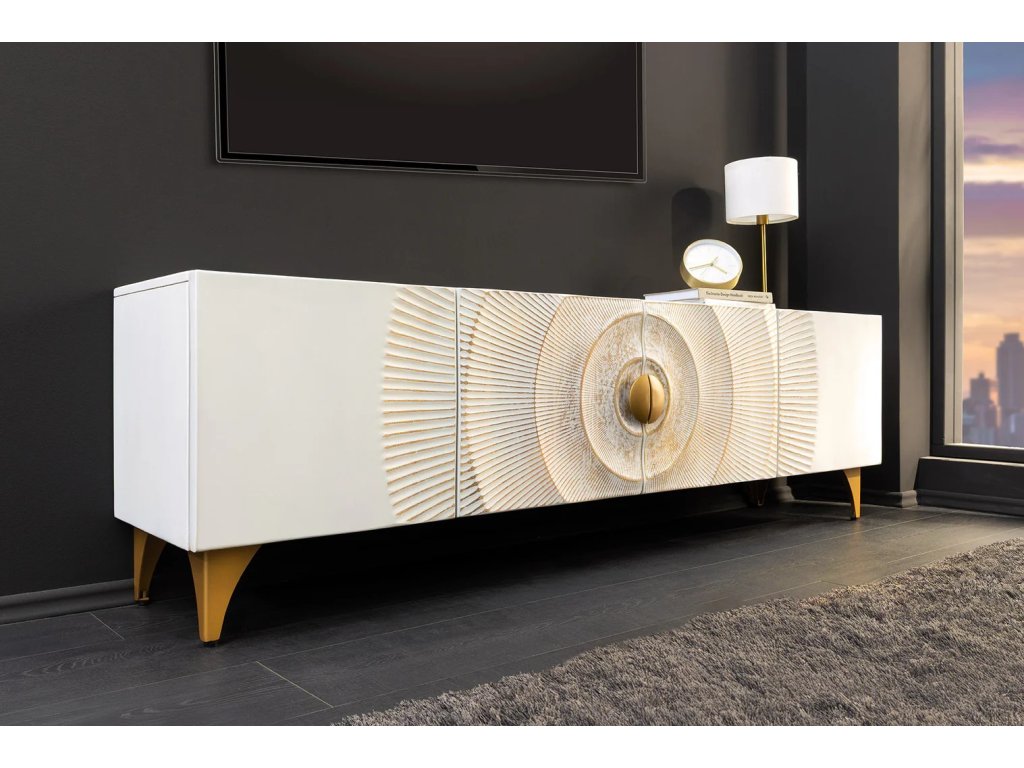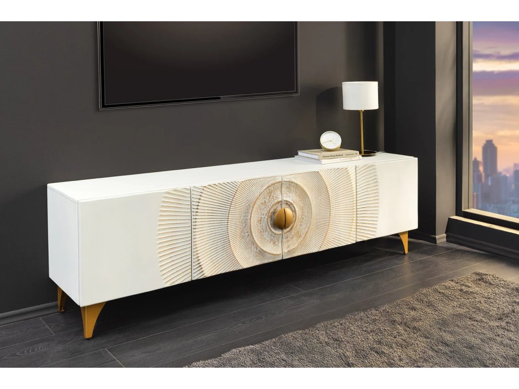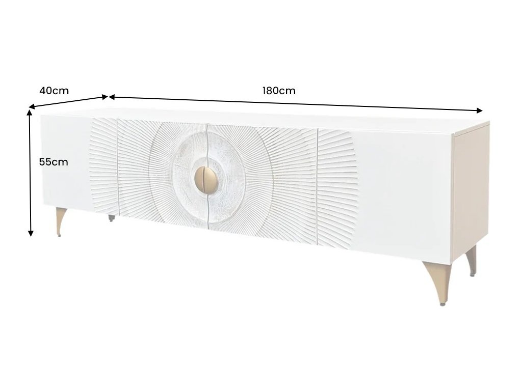 Luxusní stolek Aurelius vyniká unikátním kruhovým reliéfem, který připomíná zářící hvězdu. Kombinace bíle lakovaného masivu a zlatých detailů vytváří harmonický kontrast vhodný pro Art-Deco i moderní interiéry. Za čtyřmi magnetickými dvířky se skrývá objemný úložný prostor, zatímco vysoké podnoží zajišťuje elegantní postoj a snadný úklid.