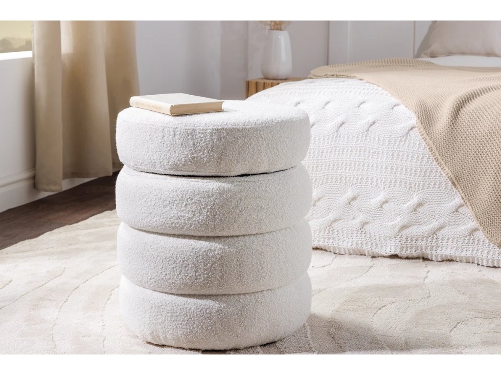 Moderní bouclé taburet v bílé barvě s výškou 49 cm je praktickým a zároveň stylovým doplňkem každého interiéru. Díky elegantnímu designu a oblíbenému bouclé čalounění působí nadčasově a snadno zapadne do moderního obývacího pokoje, ložnice nebo chodby. Pod pohodlným sedákem se skrývá praktický úložný prostor, který je ideální na deky, polštáře či jiné drobnosti. Taburet tak spojuje estetiku s funkčností a poskytuje pohodlné sezení i chytré řešení pro ukládání.