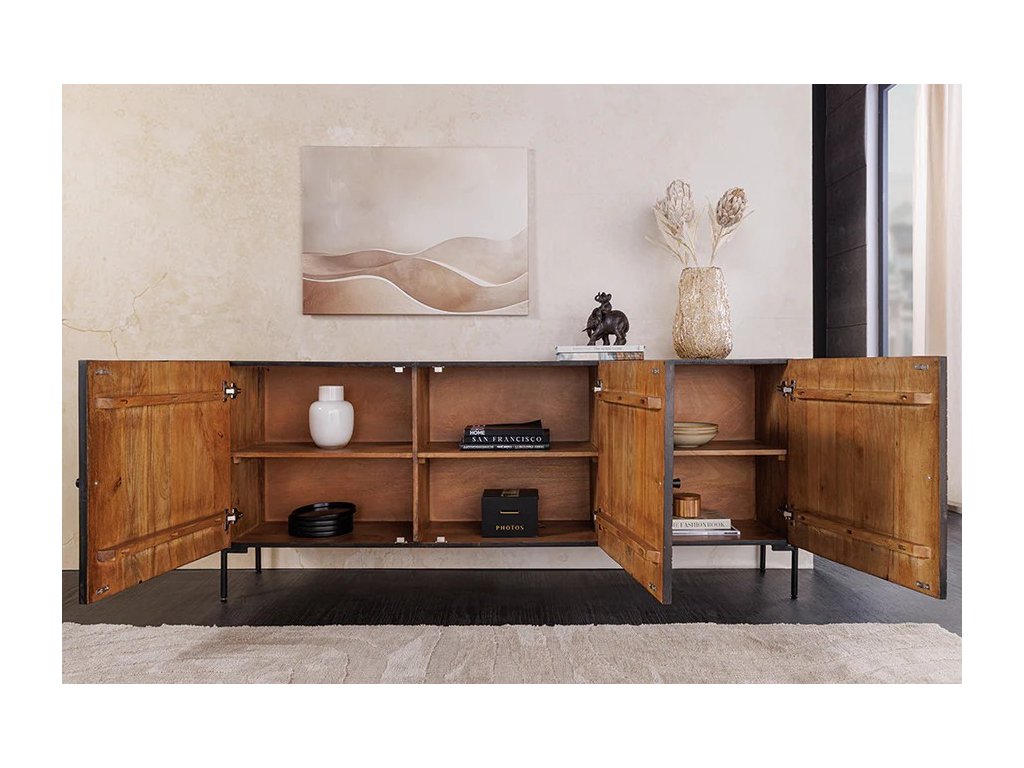 Kombinace tmavě hnědé barvy dřeva a černých kovových nohou zajišťuje nadčasový kontrast, který se hodí jak do moderních, tak rustikálních interiérů. Díky své délce 177 cm poskytuje příborník dostatek úložného prostoru a zároveň působí harmonicky a vyváženě. Zadní deska je vyrobena z dýhovaného dřevovláknitého materiálu, což zajišťuje pevnost a dlouhou životnost.