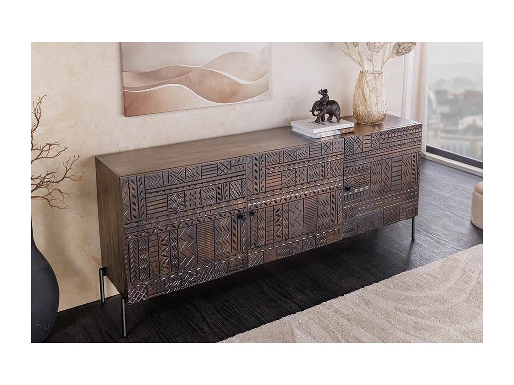 Elliot je vyroben z masivního mangového dřeva, které je známé svou odolností, výraznou kresbou a exotickým původem. Povrch je ošetřen lakem, což chrání materiál a zvýrazňuje přirozenou strukturu dřeva. Čelní 3D reliéfní vzor v antique stylu dodává nábytku unikátní vzhled, díky němuž se stane dominantním prvkem každé místnosti.