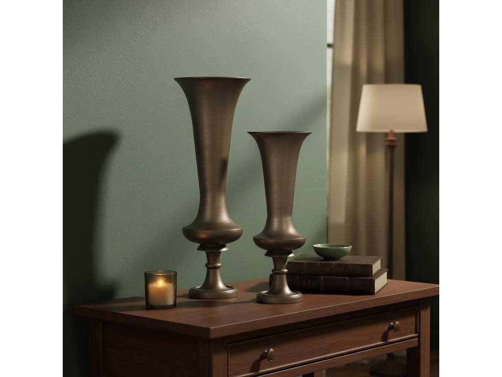 Set váz Villa je oslavou řemeslné nedokonalosti a nadčasové estetiky. Obě vázy jsou vyrobeny z kvalitního hliníku, jehož povrch je upraven do hrubé, texturované podoby, která jim dodává autentický a charismatický vzhled. Větší váza s výškou 80 cm vyniká štíhlou siluetou, která je ideální pro vertikální květinové aranže, zatímco menší váza o výšce 62 cm s širším hrdlem se skvěle hodí pro bohatší kytice. Povrchová úprava v odstínu antik bronz s jemnými mosaznými odlesky vnáší do prostoru teplo a luxusní atmosféru. Díky celkové hmotnosti 9 kg je set stabilní a nevyžaduje žádnou montáž.