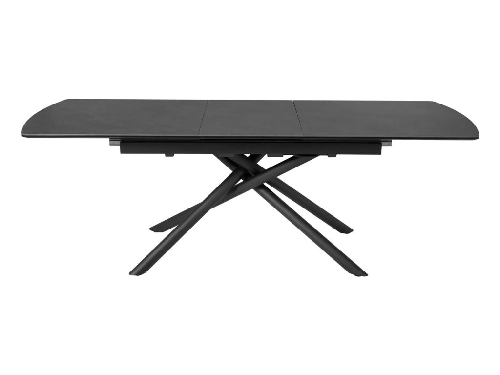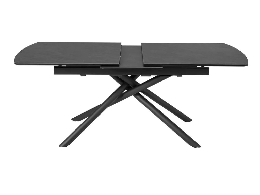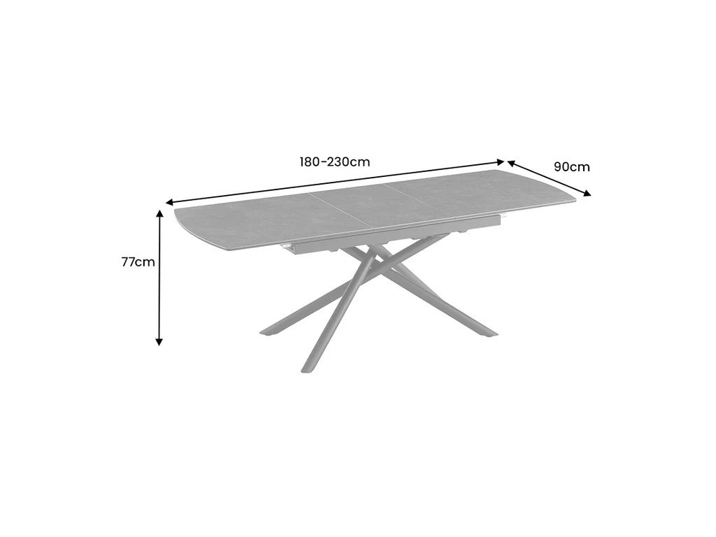 Stolová deska je vyrobena z vysoce odolné keramiky v grafitovém mramorovém dekoru, pod kterou se nachází vrstva tvrzeného skla o síle 10 mm. Tato kombinace materiálů zajišťuje dlouhou životnost, odolnost proti poškrábání i snadnou údržbu. Desku nese stabilní rám z kovu s černým práškovým lakováním, který stolu dodává industriální šmrnc a zaručuje maximální stabilitu. Díky chytré rozkládací funkci lze délku stolu plynule prodloužit až na 230 cm, takže se hodí pro každodenní rodinné stolování i větší oslavy. Maximální nosnost stolu činí 60 kg.