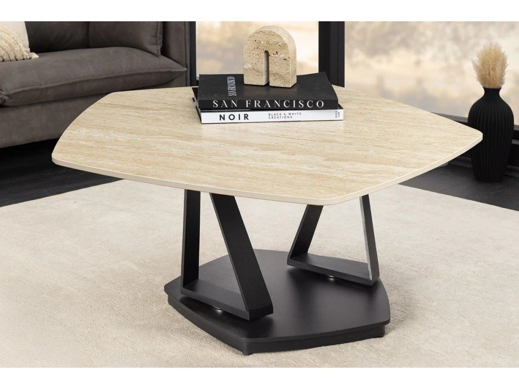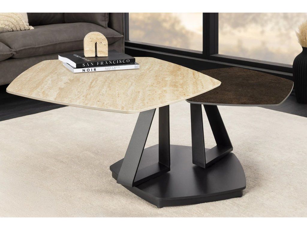 Tento designový konferenční stolek s rozměry 80–130 cm je originálním a praktickým kouskem do moderních interiérů. Otočná horní deska z odolné keramiky nabízí efekt přírodního travertinu v kombinaci s rezavým vzhledem, čímž vytváří jedinečný vizuální dojem. Díky robustní konstrukci a tloušťce desky 10 mm zaručuje vysokou stabilitu a odolnost při běžném používání.