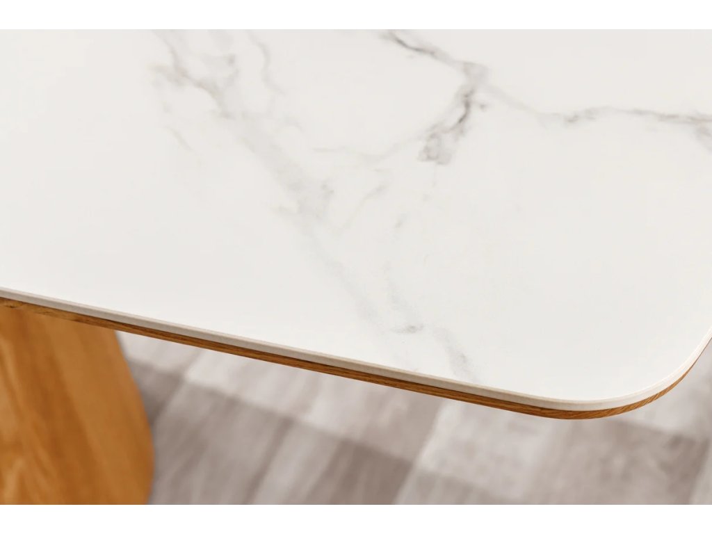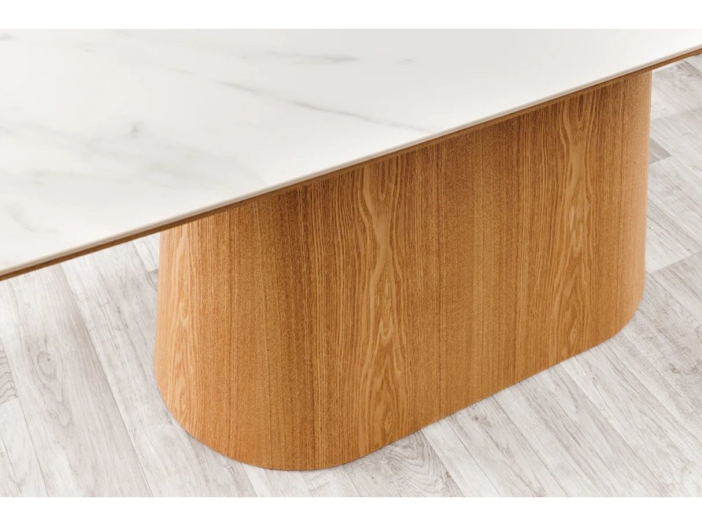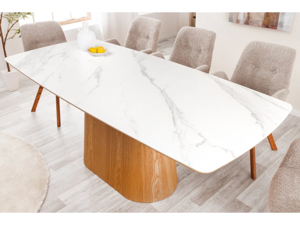 Stylový jídelní stůl Regiona 200cm v sobě spojuje luxusní vzhled a praktickou funkčnost. Deska v dekoru bílého mramoru je vyrobena z kombinace dýhované MDF a kvalitní keramiky, což zaručuje vysokou odolnost vůči poškrábání i teplotě. Podnož v hřejivém odstínu světleho dubu dodává stolu stabilitu a sofistikovaný vzhled.