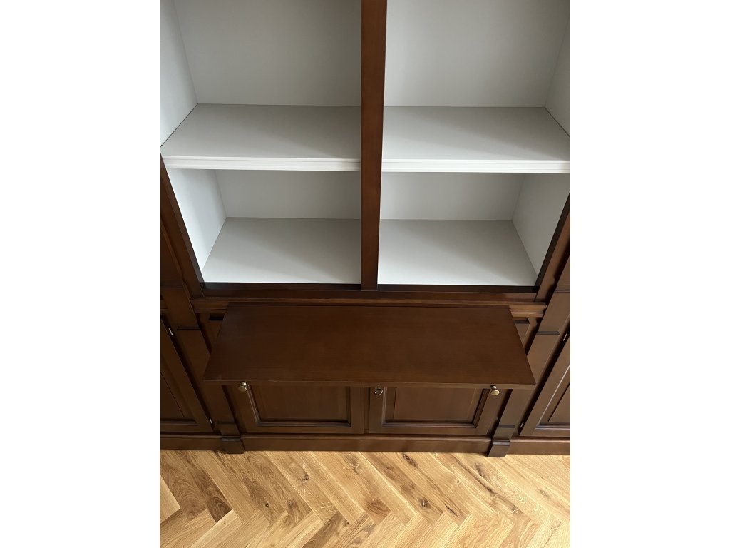 Technické informace: knihovna v klasickém luxusním stylu, kombinace otevřených polic a spodních uzavřených skříněk, určená k umístění ke stěně, vhodná do obývacího pokoje, pracovny nebo knihovny.
