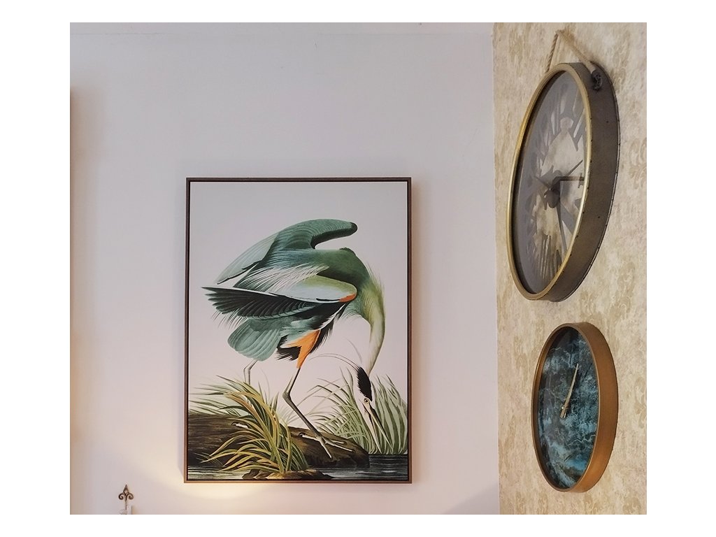 Stylový obraz vyobrazující zeleného jeřába v rákosí je překrásným doplňkem do všech interiéru. Jednoduchý avšak petrobarevný obraz krásně oživí interiér.