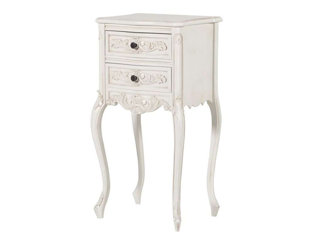 Stylový provence noční stolek Manoir o výšce 74cm navodí každému interiéru luxusní atmosféru. Francouzský historický styl se pyšní krásnými zdobenými tvary, které zjemní patinovaná barva slonové kosti. Je vyroben z masivního mahagonového dřeva, čímž je zaručena odolnost tohoto nábytku. Stolek obsahuje dvě nádherně zdobené zásuvky.