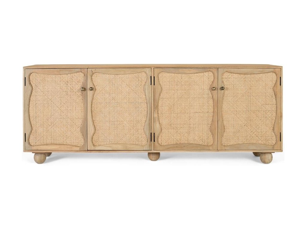 Tento elegantní solitér je ideální volbou pro obývací pokoje či jídelny, kde vytvoří hřejivou a útulnou atmosféru. Za čtyřmi dvířky s prodyšným výpletem z přírodní sítě se ukrývají dvě prostorné vnitřní police, které poskytují štědrý úložný prostor. Precizní zpracování doplňují hravé kulaté nožky, jež celou konstrukci lehce nadnášejí a dodávají jí vizuální lehkost bez ztráty stability.