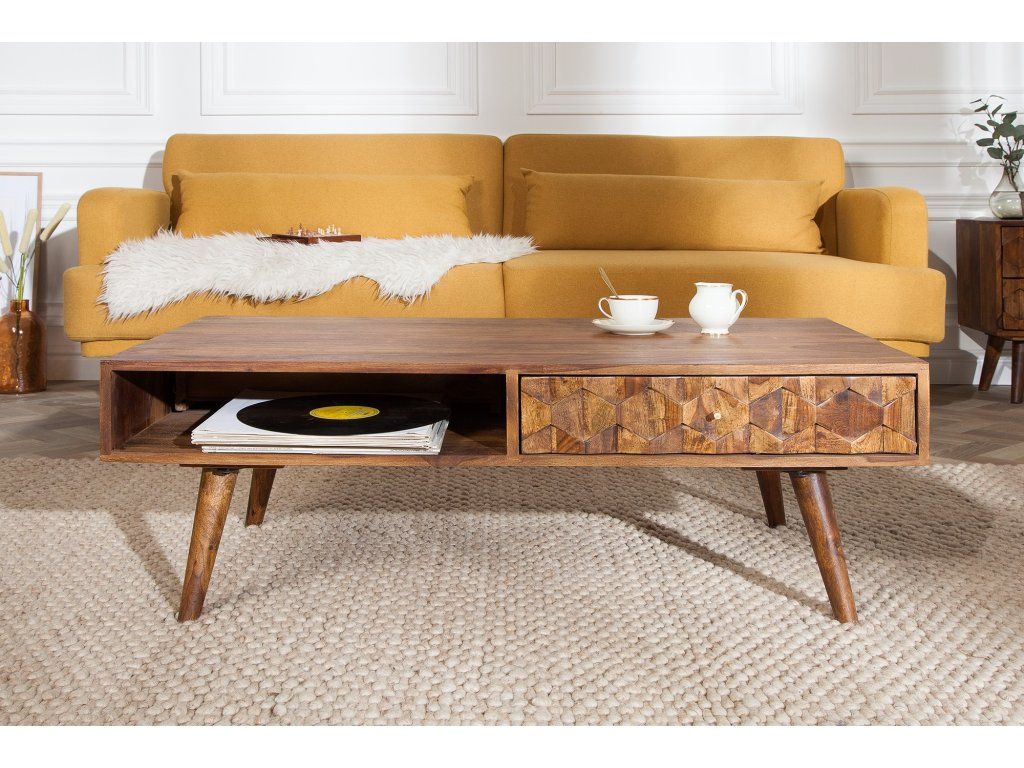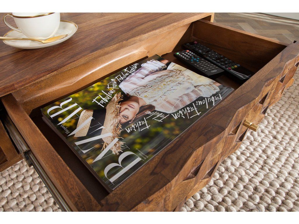 Stylový konferenční stolek z kolekce masivního nábytku Mystic je ideálním kouskem nábytku do designových a přírodně zařízených prostorů. Přes lakovaný povrch prostupuje jedinečná kresba masivu palisandr a propůjčuje mu tak unikátní vzhled. Mozaikovitě zpracované šuplíky disponují pojezdy, které zajišťují bezproblémový chod. Materiál: masivní dřevo akácie.