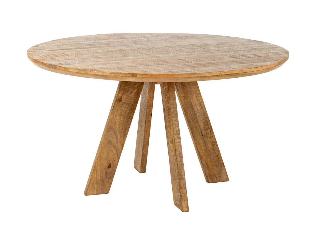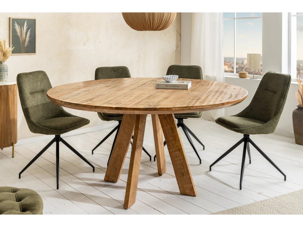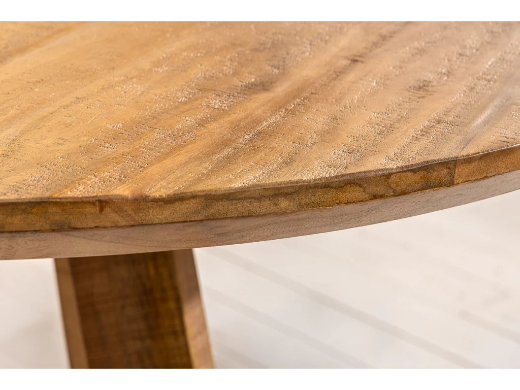 Masivní jídelní stůl Arto je výrazným prvkem každé jídelny, který spojuje přírodní krásu masivního mangového dřeva s originálním a robustním designem. Kulatý tvar jídelního stolu podporuje přirozenou komunikaci a vytváří příjemnou atmosféru při rodinných večeřích, společných setkáních i neformálních posezeních u kávy. Přírodní hnědý odstín zvýrazňuje jedinečnou kresbu dřeva a dodává interiéru teplo a autenticitu. Díky průměru 120 cm nabízí stůl dostatek prostoru a stane se nepřehlédnutelným centrem vaší jídelny.