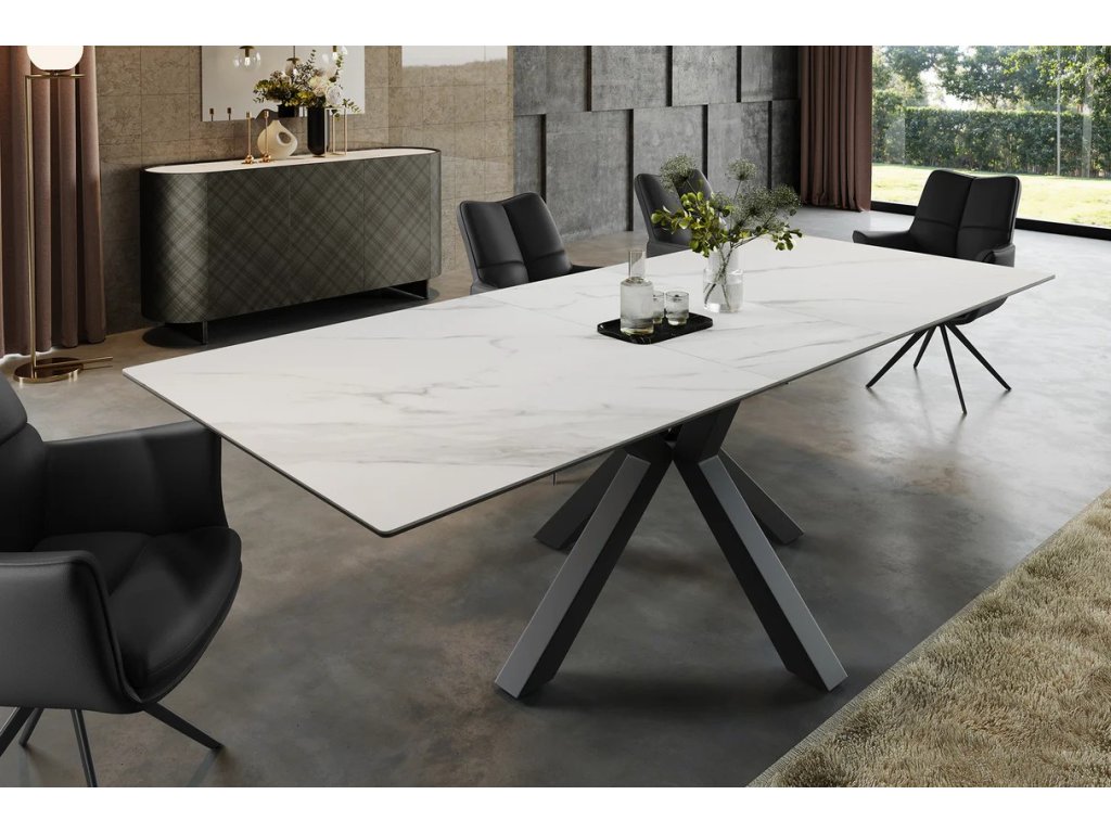 Molaniuson je jídelní stůl s rozkládací deskou o tloušťce 13 mm z bílé keramiky s realistickým mramorovým vzorem, doplněné o 3 mm tvrzené sklo, které stolu dodává jedinečný vzhled a snadnou údržbu. Konstrukce rámu je vyrobena z černě práškově lakovaného kovu, zajišťující stabilitu a odolnost. Tento design spojuje praktičnost s luxusním moderním stylem a je ideální volbou pro prostorné jídelny a reprezentativní místnosti.