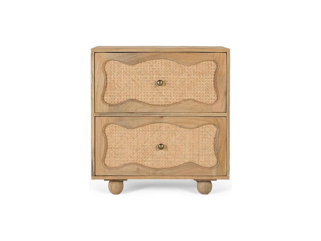 Tento nadčasový kousek je dokonalým spojením funkčnosti a přírodního designu. Noční stolek disponuje dvěma velkými zásuvkami s klasickými dřevěnými pojezdy, které poskytují štědrý úložný prostor pro vše potřebné. Čelní plochy zdobí prodyšná tkaná síť, která mu dodává nezaměnitelný rustikální a ručně zpracovaný vzhled. Kompaktní konstrukci odlehčují hravé kulaté nožky, díky nimž působí stolek stabilně, ale vizuálně velmi lehce.