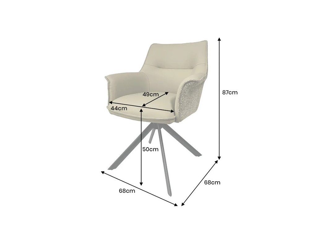 Židle Lucinious je dokonalým propojením moderního designu a funkčnosti. Sedák z pravé kůže dodává luxusní vzhled a dlouhou životnost, zatímco čalounění z texturované polyesterové látky působí elegantně a příjemně na dotek. Kovová konstrukce zajišťuje pevnost a stabilitu, zatímco otočný mechanismus umožňuje volný pohyb do úhlu 80°. Díky sedací výšce 50 cm, opěrce zad vysoké 44 cm a područkám ve výšce 63 cm poskytuje tato židle pohodlné sezení nejen u jídelního stolu, ale také v pracovně nebo moderním obývacím prostoru. Rozměry sedáku 44×49 cm zaručují dostatečný komfort a ergonomii. Černé provedení umožňuje snadné začlenění do různých stylů interiéru – od minimalistického až po industriální.