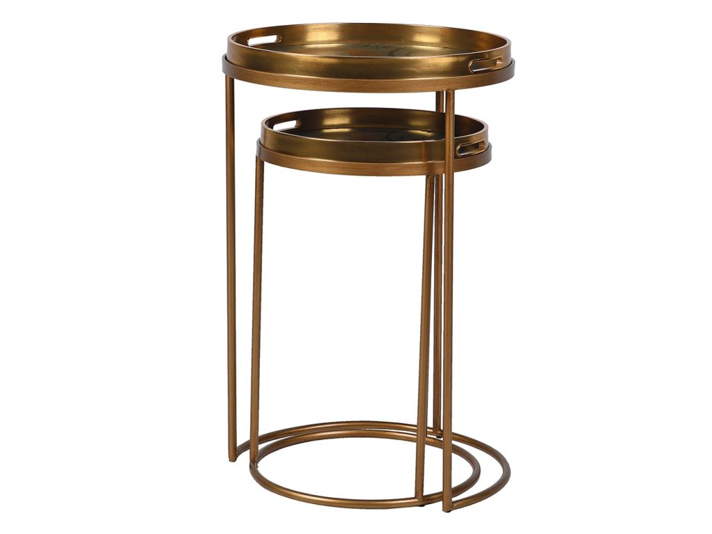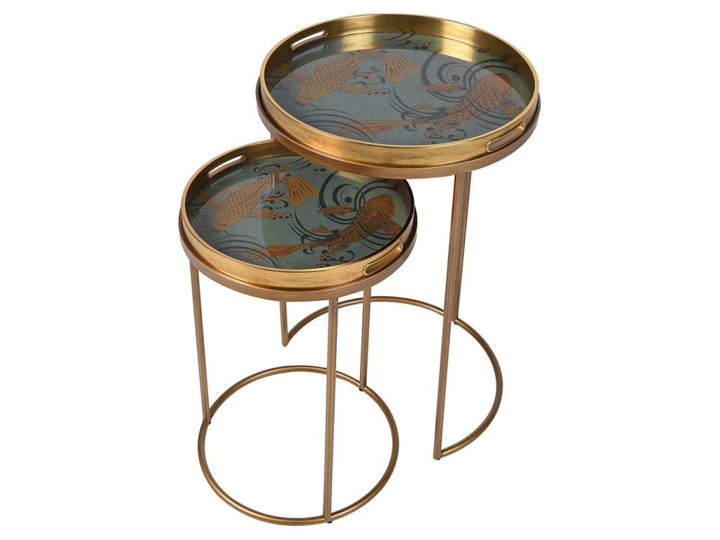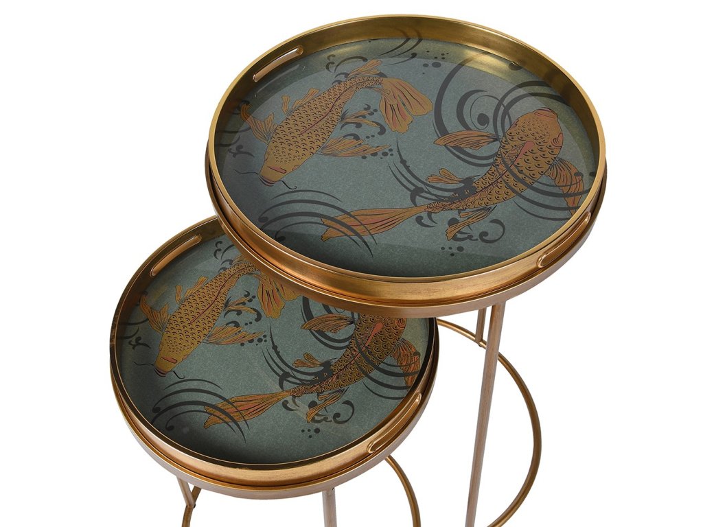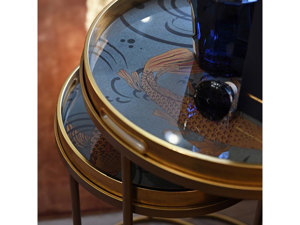 Set dvou odkládacích stolků Mari nabízí kombinaci funkčnosti a stylu. Každý stůl má dekorativní motiv zlatého koi kapra, což přidává jemný umělecký prvek do vašeho interiéru. Stoly jsou vyrobeny z kovové konstrukce a mají zlatý lesklý povrch, což zajišťuje odolnost a snadnou údržbu. Design stolků umožňuje jejich kompaktní uskladnění, přičemž menší stůl se vejde pod větší, když se nepoužívají. Ideální pro servírování, vystavení nebo jako příležitostné boční stoly.