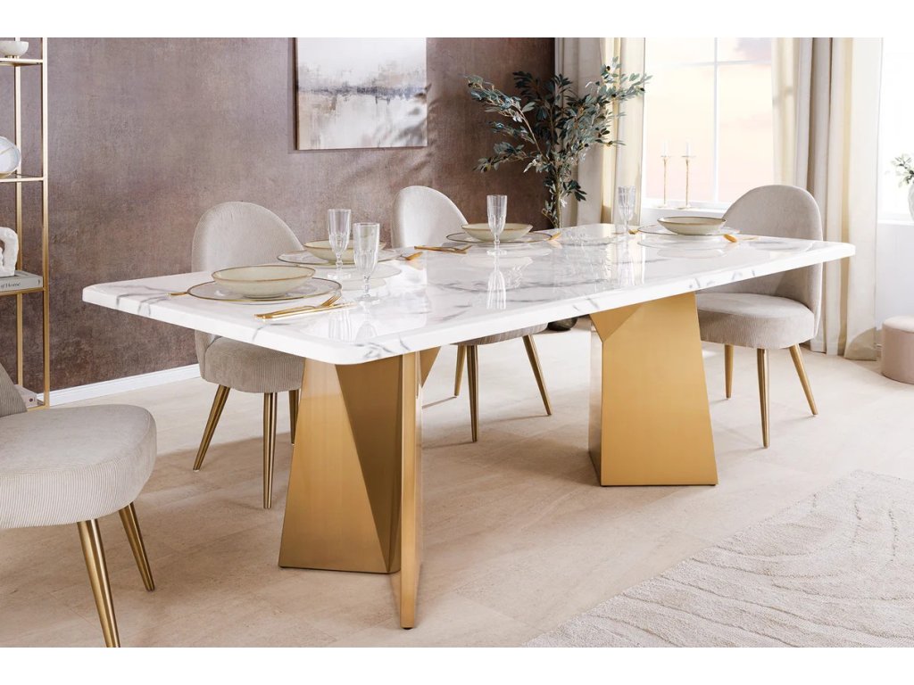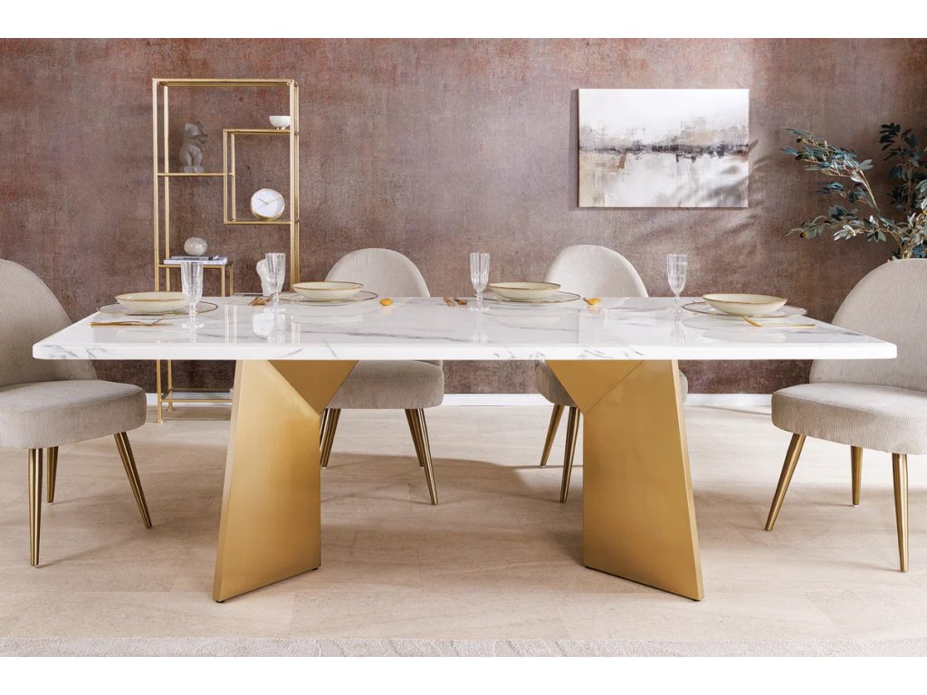 Stůl Kianimos zaujme na první pohled svým vytříbeným designem a elegantní kombinací materiálů. Vrchní deska z bílé mramorové keramiky přináší do prostoru sofistikovanost a čistotu, přičemž jemné žilkování dodává přírodní charakter a vizuální hloubku. Stylové nohy v odstínu champagne gold tvoří stabilní základ a zároveň přinášejí nádech luxusu a moderní elegance. Díky svému designovému pojetí je tento stůl ideální volbou do moderních interiérů, kde vynikne jako výrazný a zároveň praktický prvek.