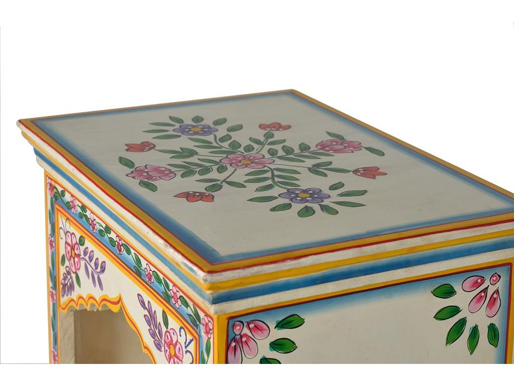 Orientální noční stolek Aurelia přináší do interiéru dávku exotické elegance. Je vyroben z kvalitního mangového dřeva a zdoben nádhernými ručně malovanými detaily, které z něj dělají skutečný umělecký kousek. Jeho jedinečný vzhled harmonicky spojuje tradiční řemeslo s moderním designem, čímž vytváří harmonický doplněk do ložnice, obývacího pokoje či předsíně. Aurelia není jen praktickým kouskem nábytku, ale také estetickým prvkem, který oživí každý prostor.