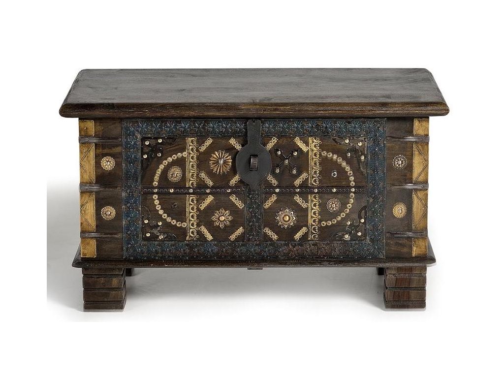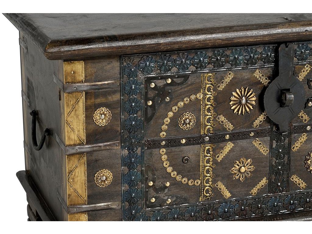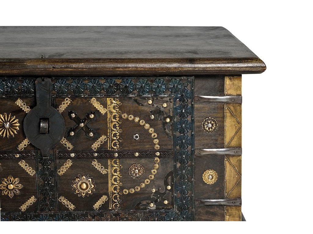 Truhla Nadia je výjimečný designový doplněk v orientálním stylu, který okouzlí svým uměleckým provedením a funkčností. Je vyrobena z masivního mangového dřeva, které se vyznačuje pevností a nádhernou kresbou. Truhlu zdobí precizně zpracované bronzové detaily, které jí dodávají nádech luxusu a historické elegance. Vintage povrchová úprava podtrhuje její autentický charakter a činí z ní působivý solitér do interiérů s duší. Ať už ji využijete jako úložný prostor, lavici nebo dekorativní prvek, truhla Nadia přinese do vašeho domova teplo a jedinečnost.