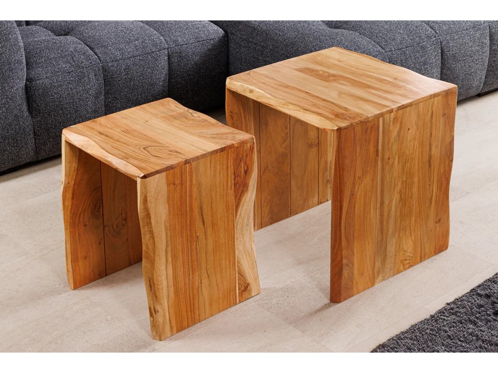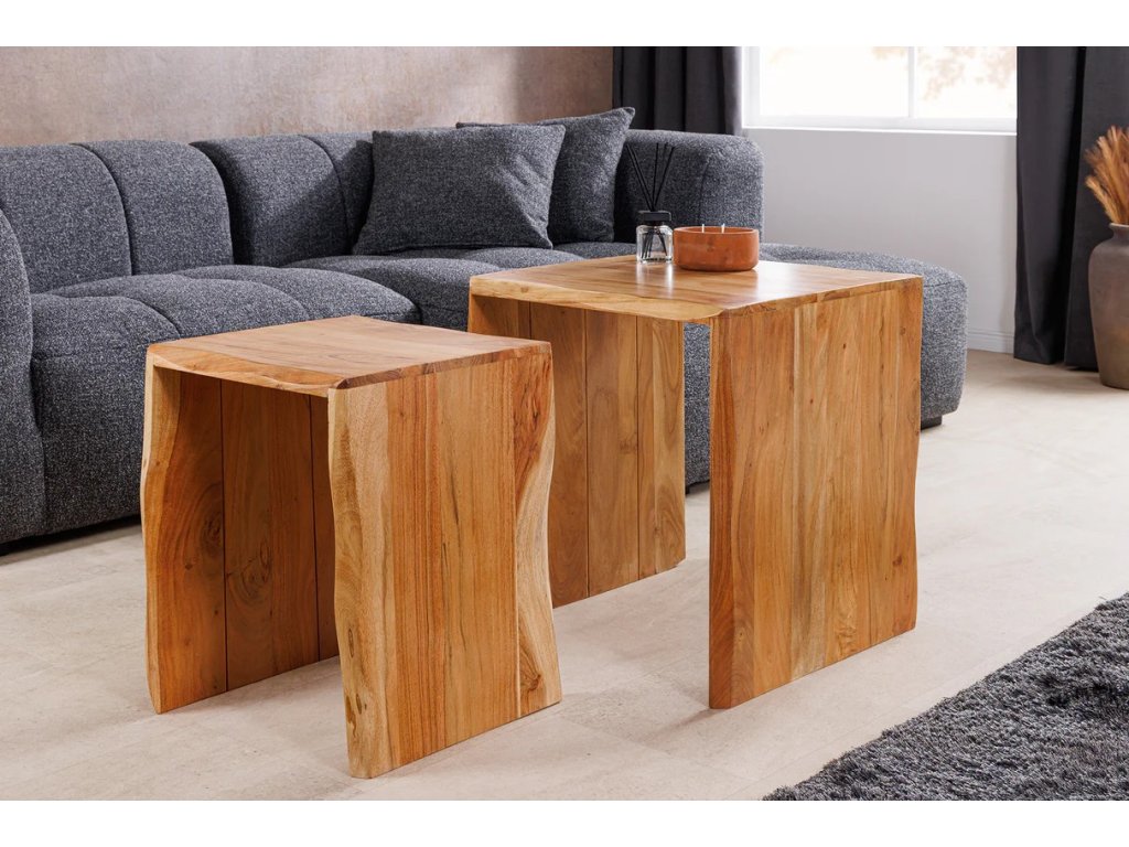 Set 2 odkládacích stolků Kameron spojuje elegantní design a funkčnost. Vyrobené z masivního akáciového dřeva s tloušťkou desky 15 mm, nabízejí vysokou odolnost a dlouhou životnost. Povrch je ošetřen kvalitním lakem, který zvýrazňuje přírodní kresbu dřeva a zároveň jej chrání před každodenním opotřebením.