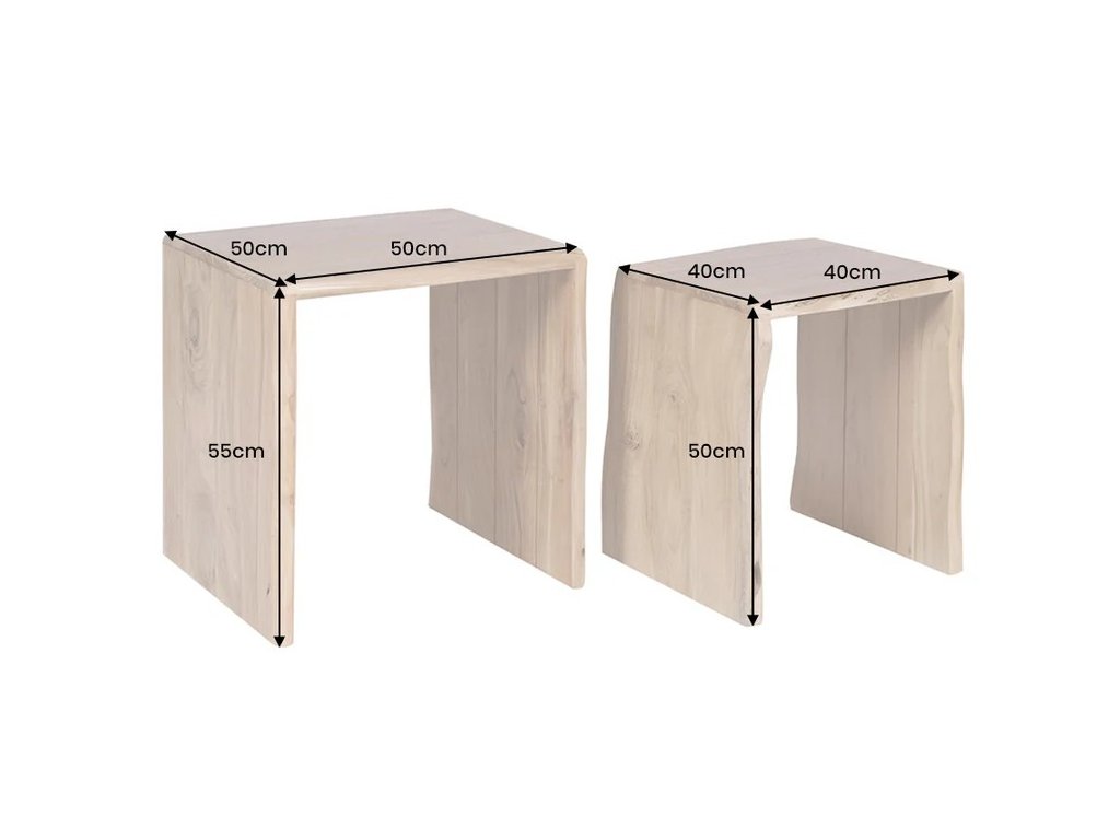 Součástí setu jsou dva stolky různých velikostí (50×55×50 cm a 40×50×40 cm), které můžete používat společně, nebo samostatně v různých částech interiéru. Díky variabilitě se hodí jako odkládací stolky do obývacího pokoje, noční stolky do ložnice nebo stylový prvek do předsíně.