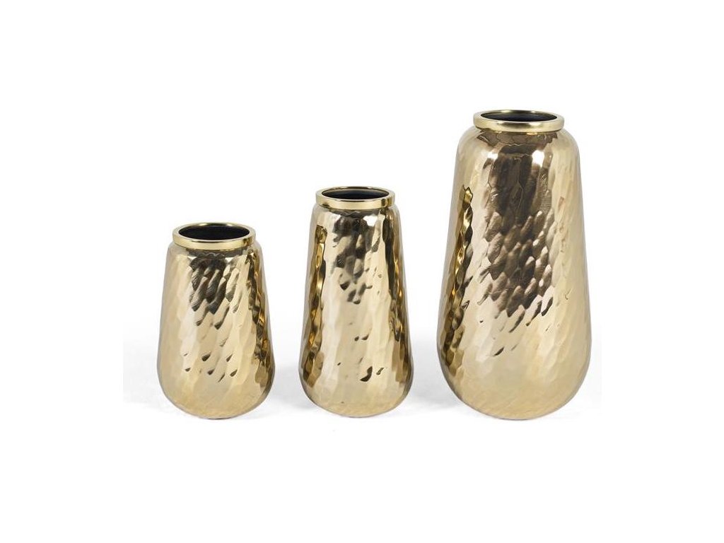 Set 3 luxusních váz Florentina je ztělesněním elegance a moderního vkusu. Tyto designové vázy jsou vyrobeny z kvalitního hliníku a zušlechtěny lesklou zlatou povrchovou úpravou, která jim dodává noblesní a sofistikovaný vzhled. Díky svému nadčasovému designu se dokonale hodí do moderních, glamour či art-deco interiérů, kde se stanou výrazným dekoračním prvkem. Každá váza v setu má jemně odlišný tvar a výšku, což umožňuje jejich kreativní uspořádání jako harmonický celek nebo samostatné akcenty v různých částech prostoru. Set Florentina dodá vašemu interiéru luxusní nádech a vkusnou eleganci, ať už jej využijete jako dekoraci na stole, komodě nebo polici.