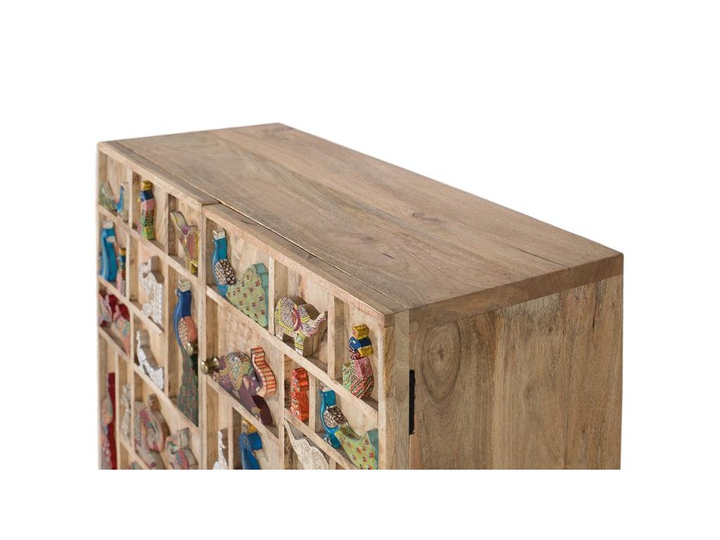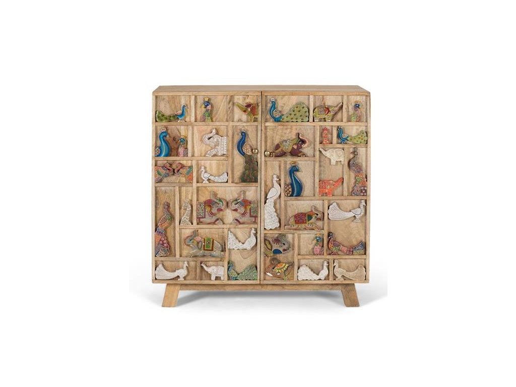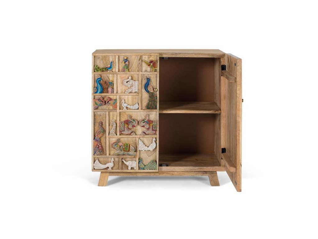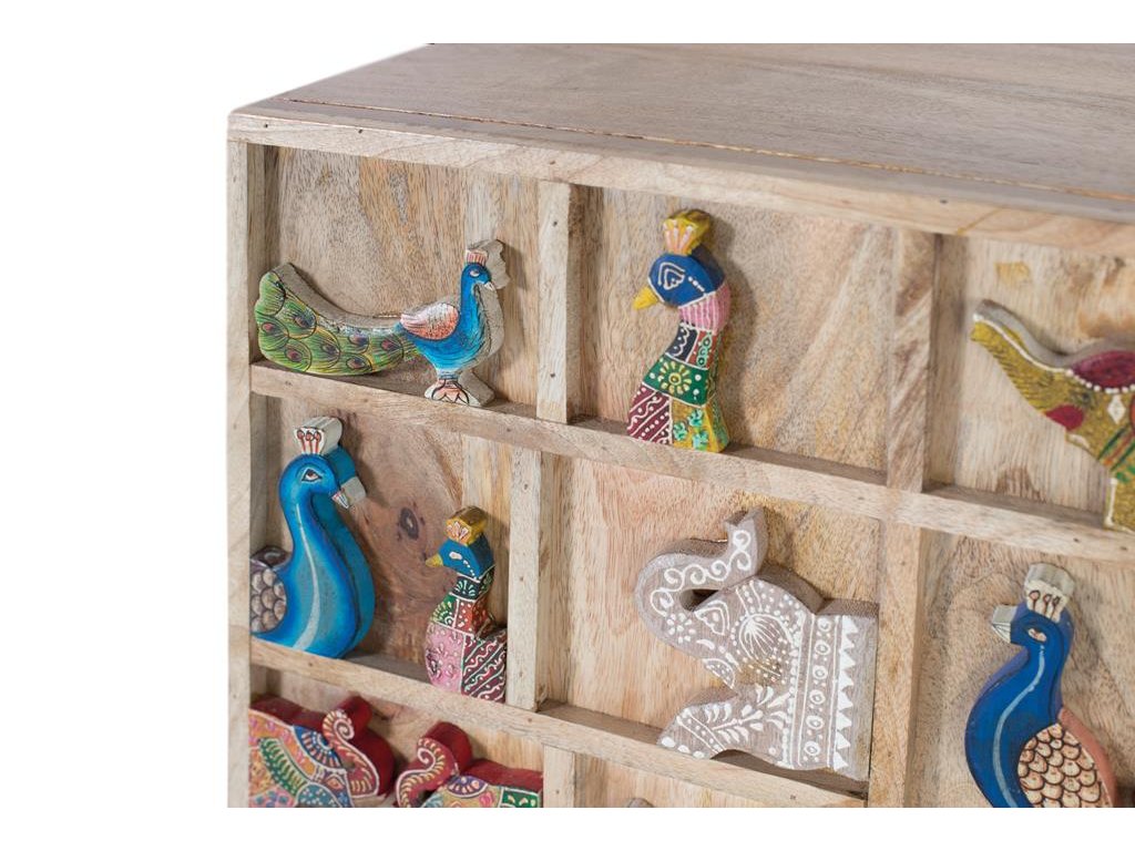 Skrinka Ariah je unikátny kúsok nábytku, ktorý v sebe spája masívne prevedenie, orientálnu estetiku a hravý umelecký prístup. Vyrobená z kvalitného mangového dreva, vyniká ručne maľovanými ornamentmi a jedinečnými figúrkami zvierat, ktoré dodávajú celej skrinke osobitý a zároveň hravý charakter. Vďaka svojej pevnosti a štýlovému vzhľadu sa stane dominantou každého interiéru — od obývačky po vstupnú halu. Ariah je viac než len úložný priestor – je to umelecký artefakt, ktorý vnáša do domova ducha originality a remeselnej precíznosti.