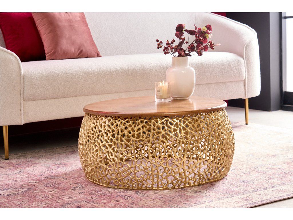 Dizajnový okrúhly konferenčný stolík Esme 75cm zlatý, s drevenou doskou, je jasnou voľbou do dizajnových priestorov. Jedinečné a neobvyklé prevedenie stolíka určite nadchne aj tie najnáročnejšie.