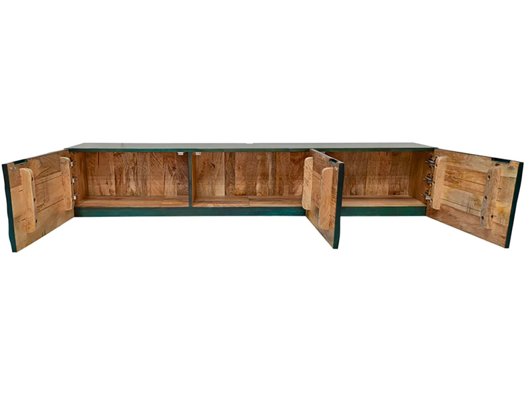 TV stolík Cassian zaujme svojim ručne vyrezávaným 3D čelom s tyrkysovou patinou, ktorá skvele kontrastuje s korpusom z masívneho manga. Závesné prevedenie dodáva stolíku modernú ľahkosť a uľahčuje údržbu podlahy. Vnútri nájdete tri priestranné skrinky so zlatými úchytmi pre všetku elektroniku. Vďaka ručnej práci a prírodnému materiálu je každý kus jedinečným originálom, ktorý do interiéru vnesie punc luxusu.