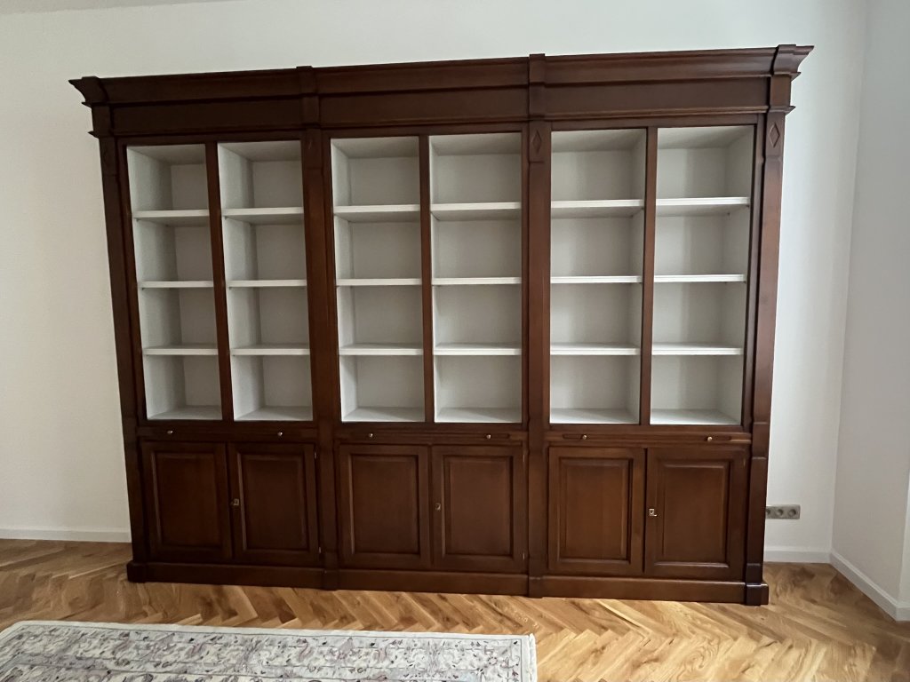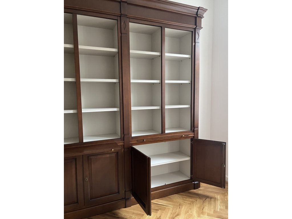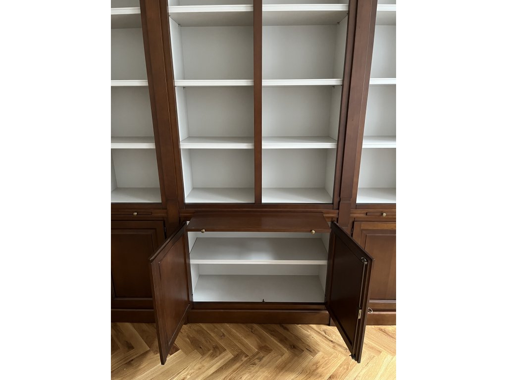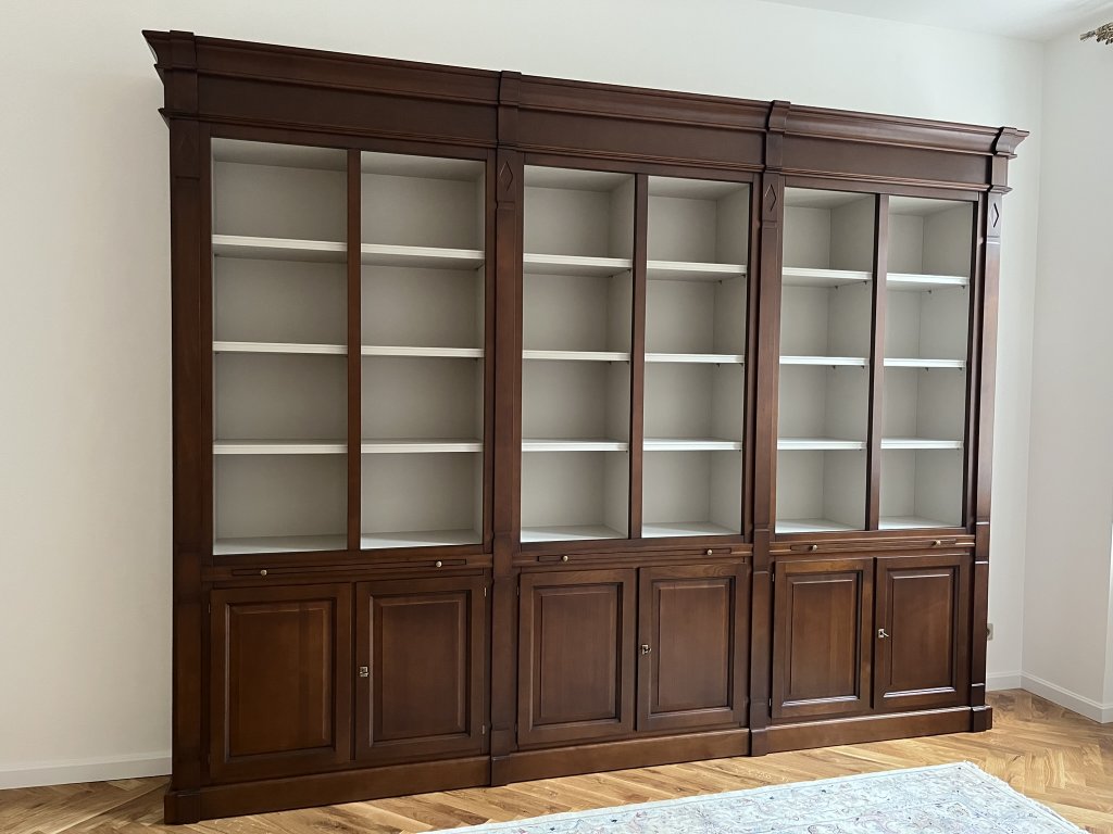 Technické informácie: Knižnica v klasickom luxusnom štýle, kombinácia otvorených políc a spodných uzavretých skriniek, určená na umiestnenie k stene, vhodná do obývacej izby, pracovne alebo knižnice.