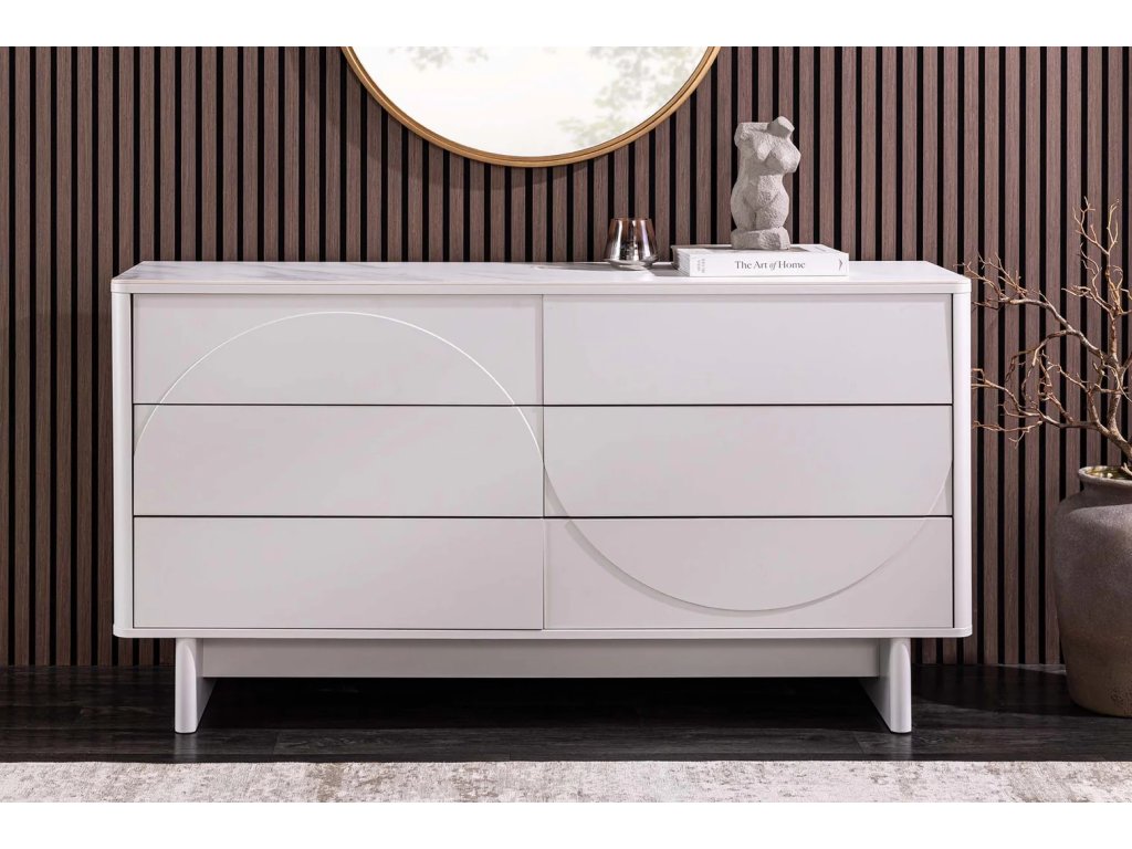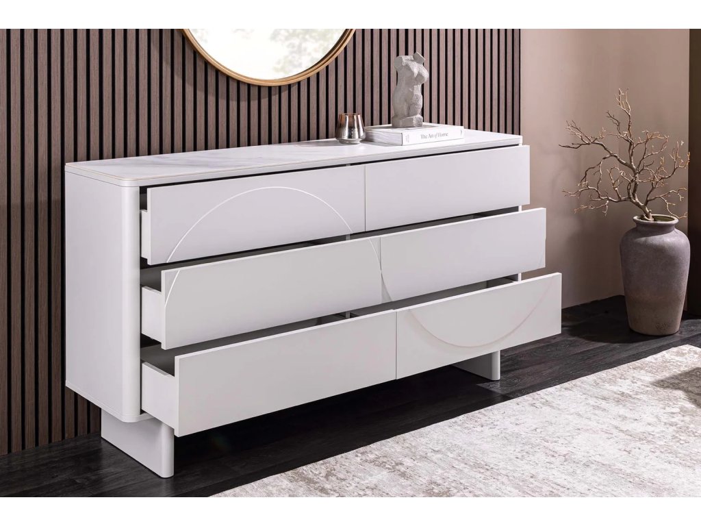 Dizajnová komoda Salon White spája čisté línie, lakovaný povrch a luxusný vzhľad keramickej dosky s dekorom bieleho mramoru. Vďaka šiestim priestranným zásuvkám ponúka dostatok miesta na prehľadné uloženie dokumentov, doplnkov i ďalších nevyhnutností. Pevná konštrukcia z lakovaného MDF zaisťuje stabilitu a dlhú životnosť, zatiaľ čo svetlé prevedenie opticky rozjasní interiér a podčiarkne jej moderný charakter.