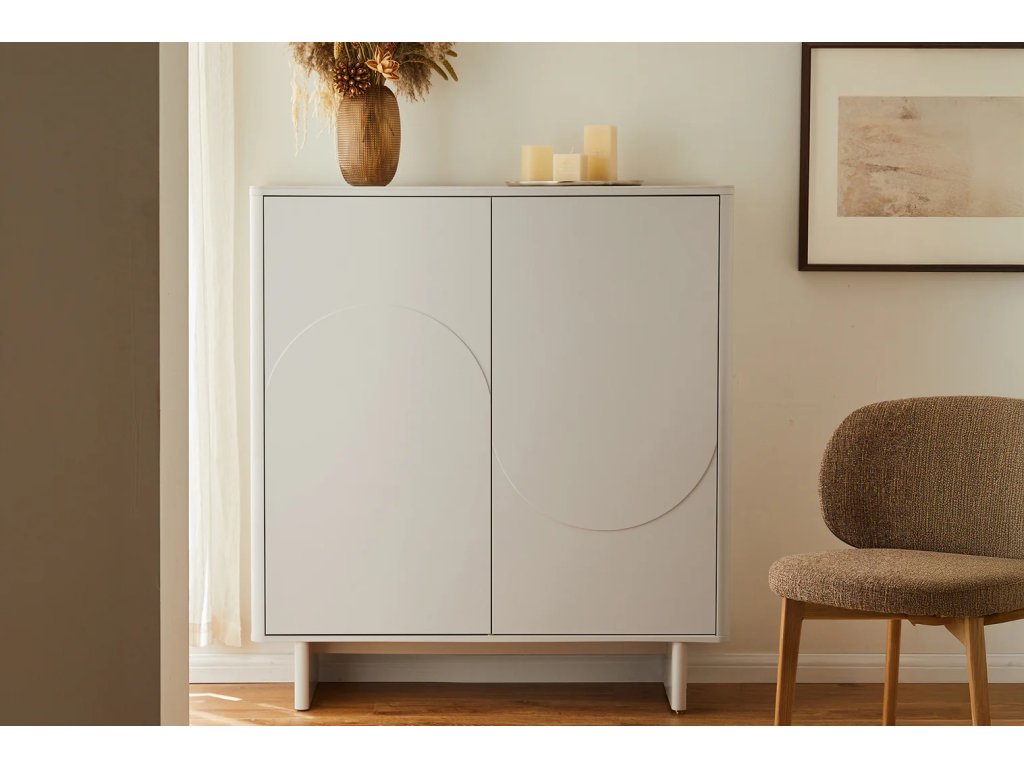 Štýlová moderná skrinka Salon White zaujme čistými líniami, lakovaným povrchom a keramickou doskou s dekorom bieleho mramoru, ktorá dodáva nábytku luxusný vzhľad. Ponúka šesť uzavretých políc, vďaka ktorým ľahko usporiadate dokumenty, riad aj ďalšie vybavenie. Konštrukcia z lakovaného MDF zaisťuje pevnosť a dlhú životnosť, zatiaľ čo svetlé prevedenie pôsobí vzdušne a elegantne v každom modernom interiéri.