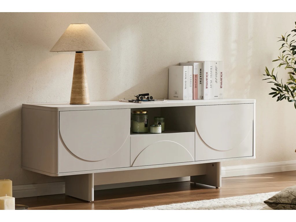 Stylový TV stolek Salon White spojuje lakované MDF v bílé barvě s odolnou keramickou deskou v dekoru bílého mramoru, díky čemuž působí luxusně a nadčasově. Nabízí kombinaci otevřené police, uzavřených úložných prostor a zásuvky, takže snadno uspořádá veškeré multimediální příslušenství. Pevná konstrukce a kvalitní zpracování zaručují stabilitu i dlouhou životnost, zatímco minimalistický design vytváří reprezentativní a harmonický celek.
