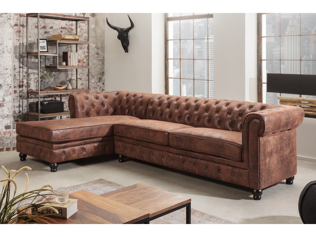 Rohová pohovka chesterfield Cintia 280 cm antická hnedá. Elegantný starožitný dizajn robí z pohovky dizajnový, ale úplne nový kúsok vhodný najmä do moderne alebo retro zariadených priestorov.