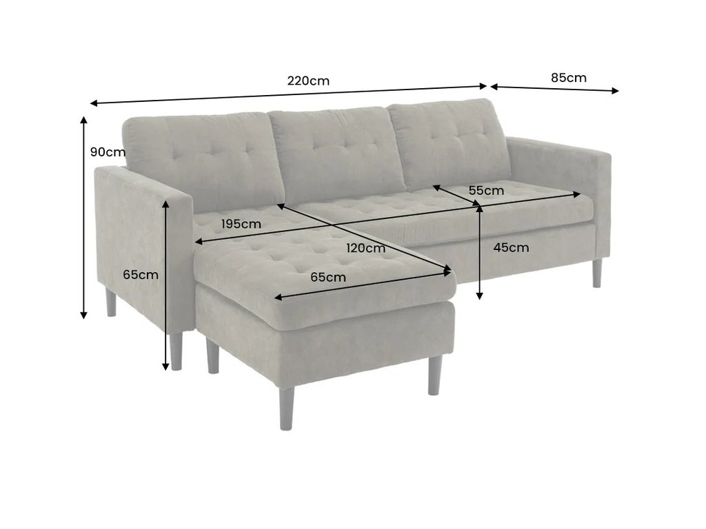 Pohodlná výška sedu 45 cm a hlboké sedadlo zabezpečujú vysoký komfort pri sedení, zatiaľ čo široký otoman s rozmermi 65 × 120 cm rozširuje možnosti oddychu. Moderný dizajn s jednoduchými tvarmi a vyváženými proporciami robí z pohovky Ismonia výrazný, no zároveň harmonický prvok interiéru.