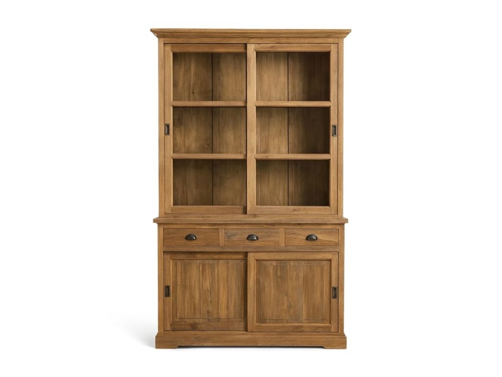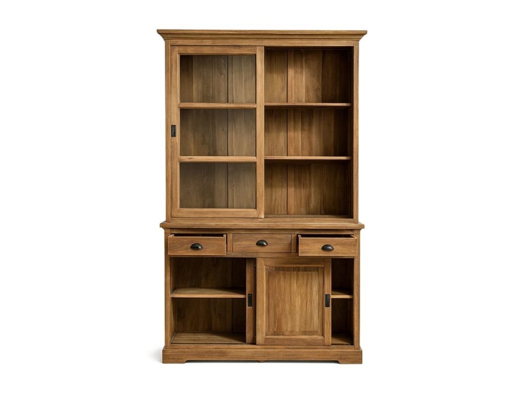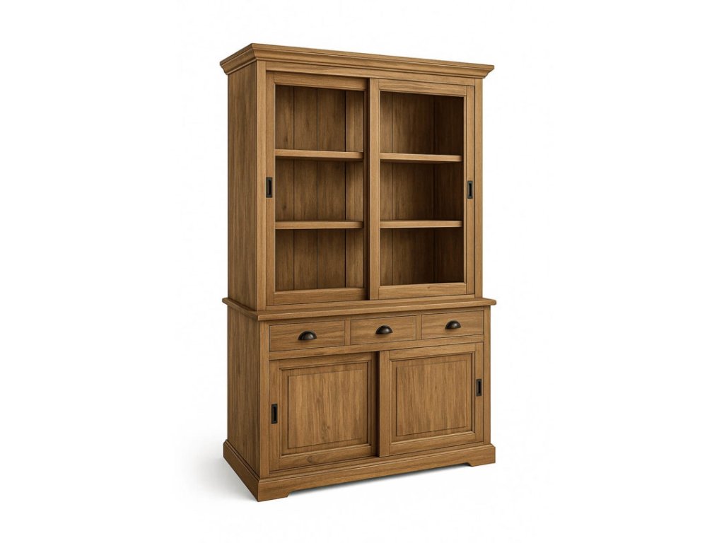 Štýlová vitrína Feroe Teka je vyrobená z masívneho teakového dreva, ktoré vyniká výraznou kresbou, pevnosťou a dlhou životnosťou. Vďaka výške 220 cm poskytuje dostatok priestoru na vystavenie dekorácií, keramiky, skla či kníh. Spodná časť ponúka tri priestranné zásuvky, zatiaľ čo horná časť je chránená dvoma posuvnými dvierkami, ktoré šetria miesto a zároveň umožňujú ľahký prístup.