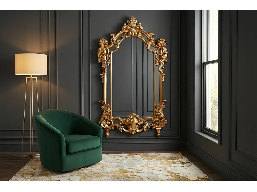 Vintage zlaté zrkadlo Eleonora prináša do interiéru sofistikovaný glamour štýl a luxusný zlatý akcent, ktorý okamžite upúta pozornosť. Tento štýlový dizajnový doplnok vyniká výrazným rámom s bohatým leskom, ktorý dodáva priestoru hĺbku, svetlo a exkluzívnu atmosféru. Elegantné proporcie a vertikálna orientácia z neho robí dominantný prvok vhodný do obývacej izby, spálne, vstupnej haly či reprezentatívnych komerčných priestorov.