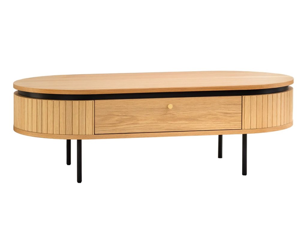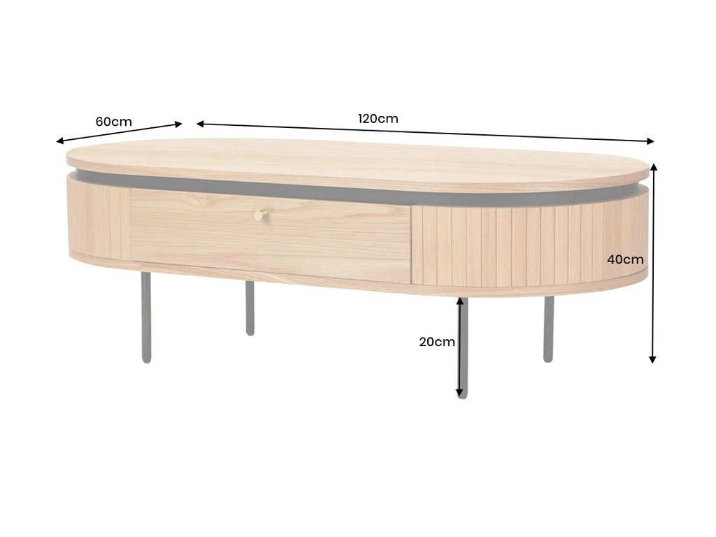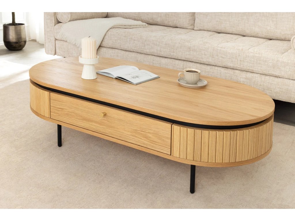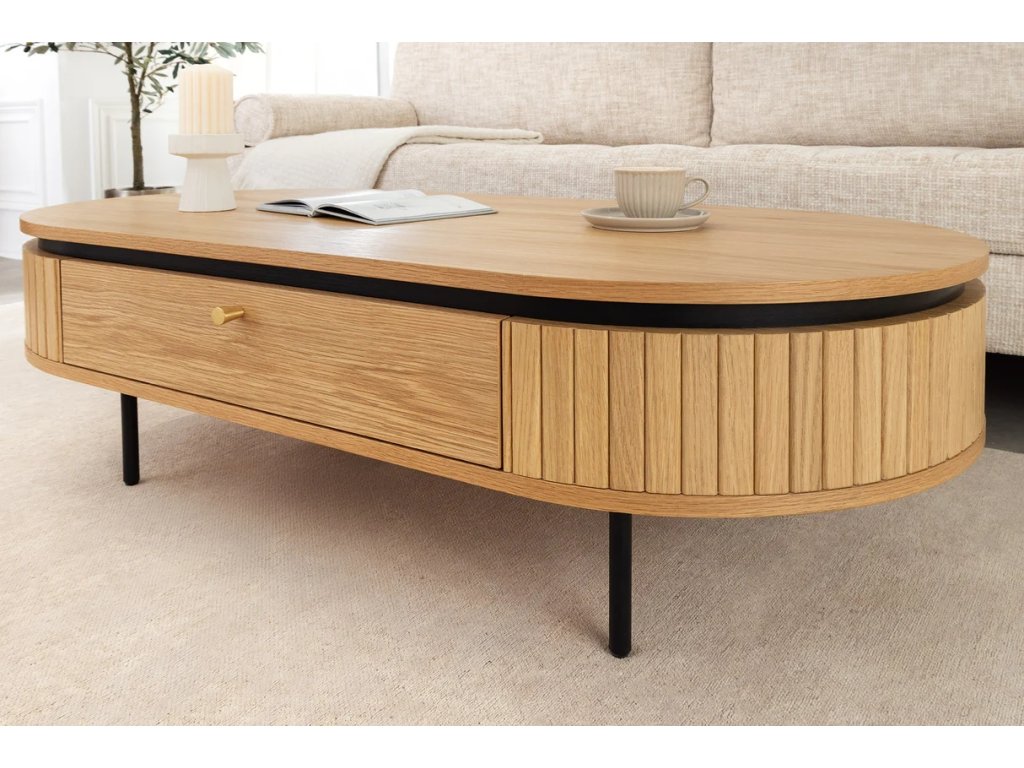 Štýlový konferenčný stolík Luminia s dĺžkou 120 cm kombinuje prírodný vzhľad dubovej dyhy s modernou čiernou kovovou podstavou. Je vyrobený z odolného dreveného materiálu s povrchovou dubovou dyhou, ktorá podčiarkuje jeho prírodný charakter.