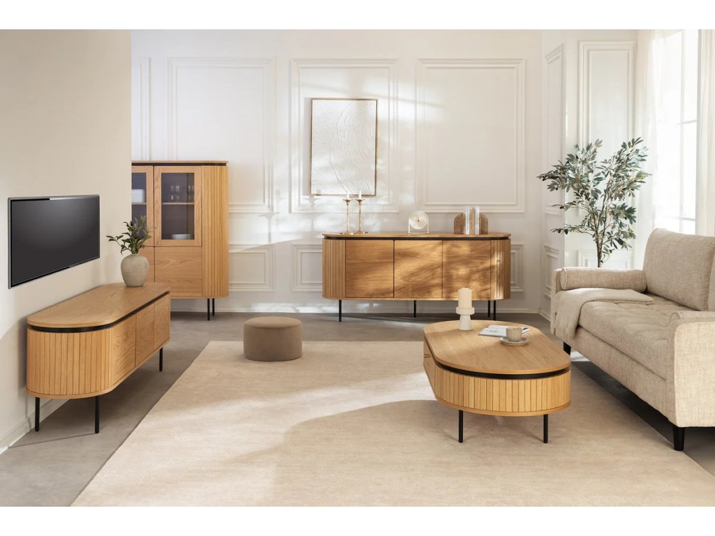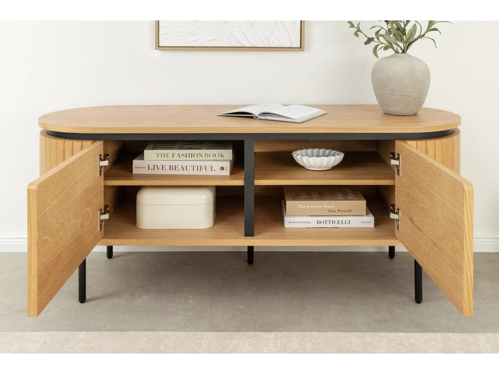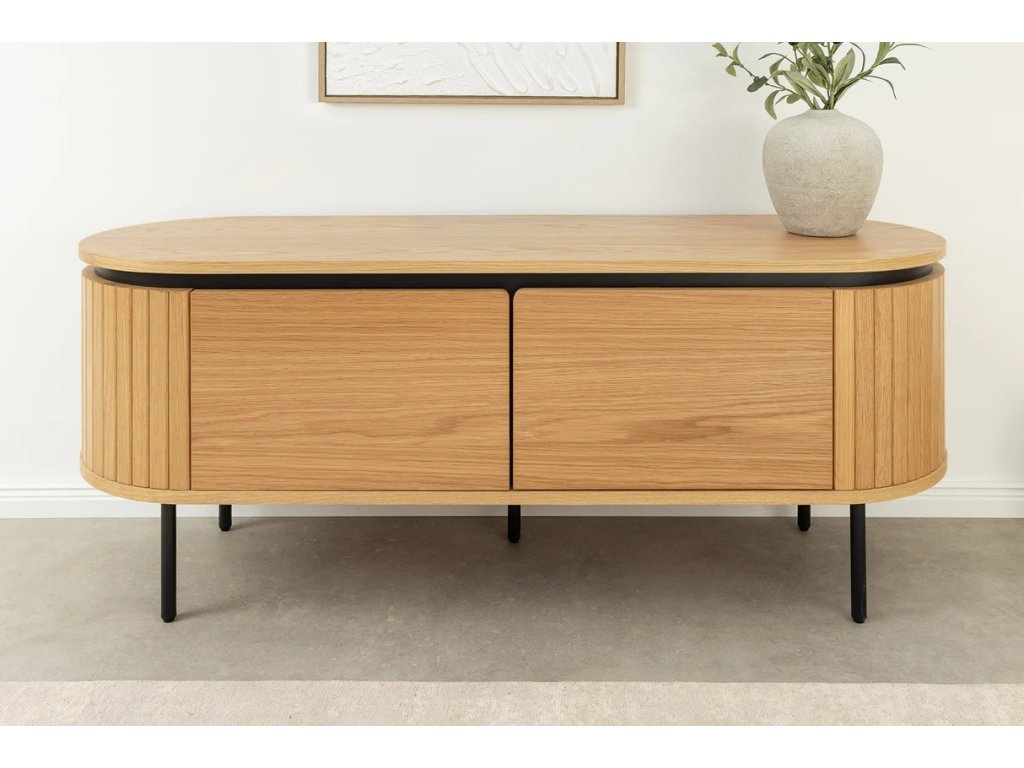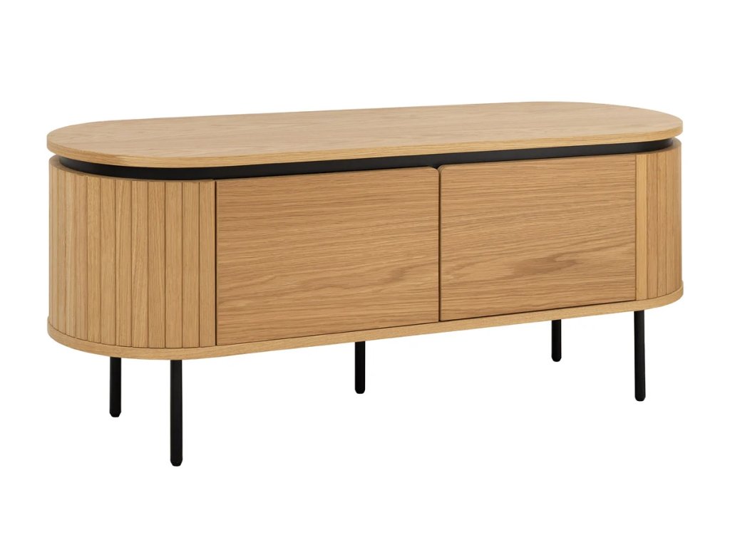Moderný TV stolík Luminia spája teplý dekor duba s čistými líniami čiernych kovových nôh a vytvára moderný a nadčasový prvok obývacieho priestoru. Uzatvárateľné úložné priestory s magnetickým zatváraním umožňujú prehľadné uloženie elektroniky, doplnkov a káblov. Stabilná konštrukcia zaisťuje pevnosť a dlhú životnosť, zatiaľ čo zvýšené nohy dodávajú ľahkosť a uľahčujú upratovanie pod stolíkom. TV stolík Luminia je ideálny pre moderné, minimalistické aj industriálne interiéry, kde sa kombinuje funkčnosť s elegantným dizajnom.