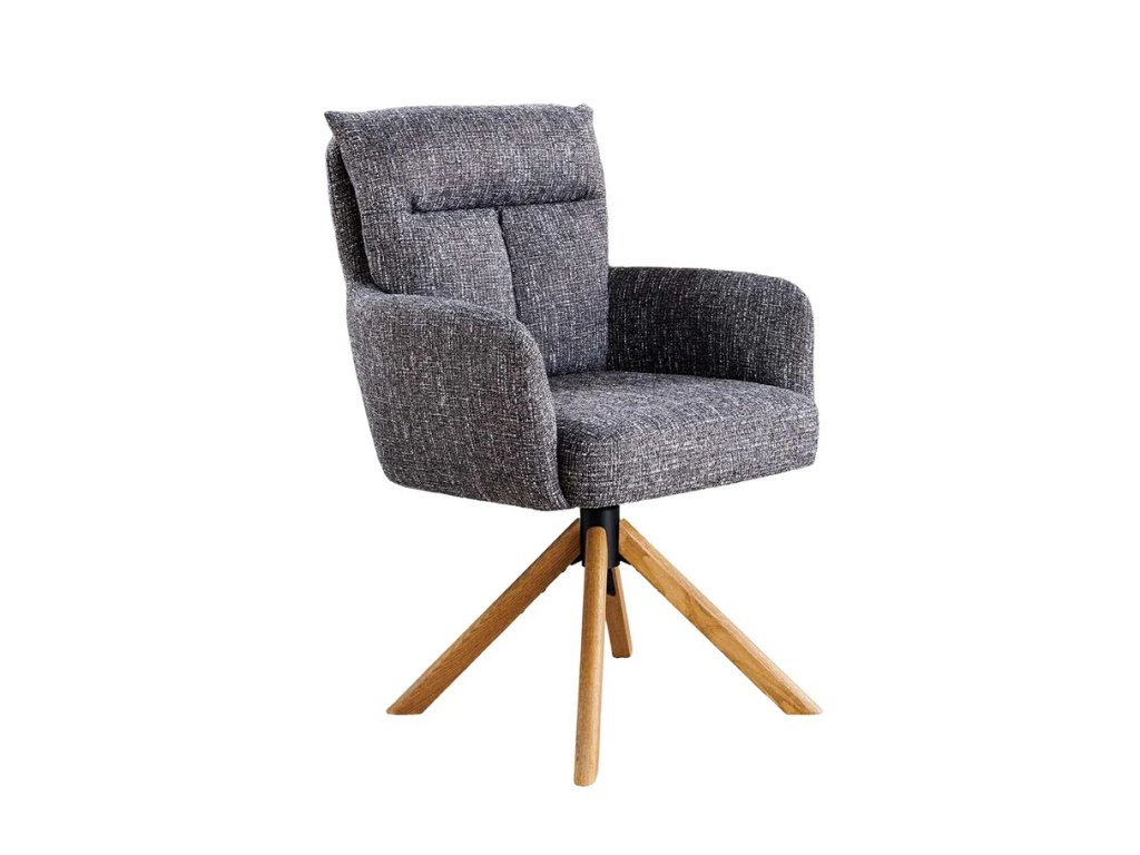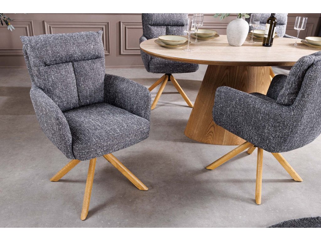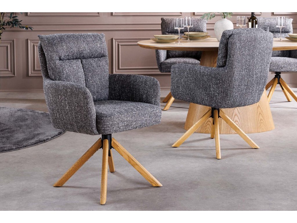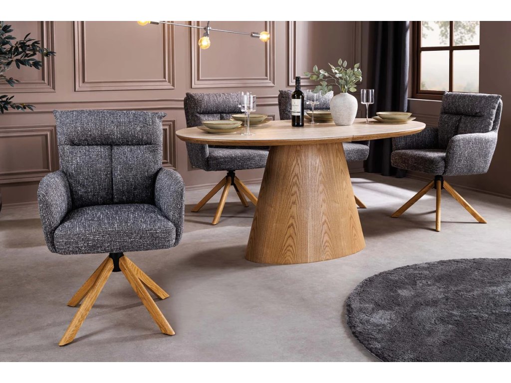 Designová komfortní židle Big Gina Oak přináší harmonii moderní estetiky, přírodních materiálů a každodenního komfortu. Otočný sedák s funkcí automatického návratu zajišťuje plynulý a vyvážený pohyb, zatímco čalounění z texturované látky v zeleném odstínu dodává interiéru sofistikovaný vzhled. Masivní dubové nohy podtrhují přirozený charakter židle a zajišťují stabilitu. Díky pohodlnému tvarování, područkám a ideálním proporcím je Big Gina Oak vhodná jako jídelní židle, křesílko do obývacího pokoje i stylová židle do domácí kanceláře.