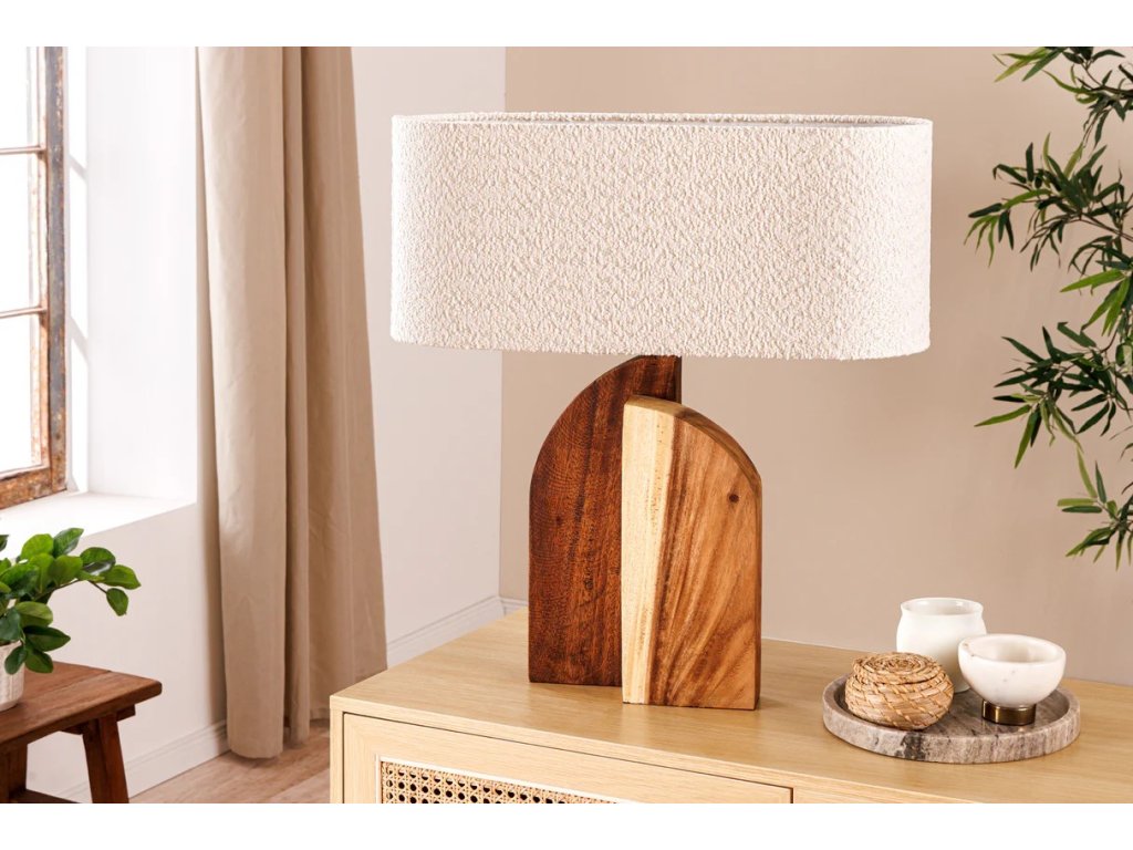 Stylová stolní lampa CLAVERS 60 cm z přírodního dřeva Rain Tree se stínidlem bouclé v bílé barvě