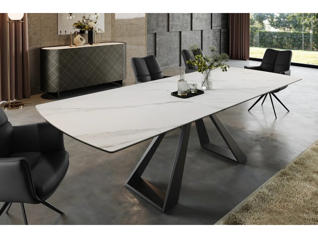Rozkládací jídelní stůl Koneraq 180–230 cm kombinuje elegantní estetiku s praktickým řešením pro každodenní i slavnostní stolování. Horní deska o tloušťce 20 mm je tvořena keramickým povrchem s bílým mramorovým efektem a podkladovým tvrzeným sklem o tloušťce 6 mm, což zajišťuje odolnost vůči poškrábání, teplu i vlhkosti.