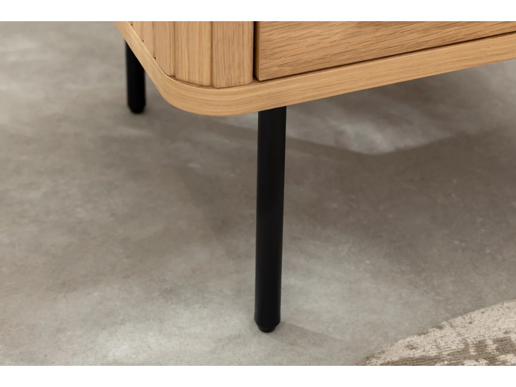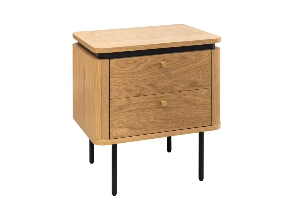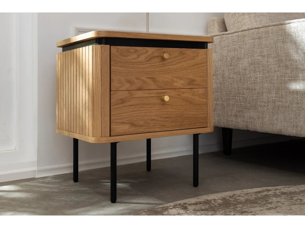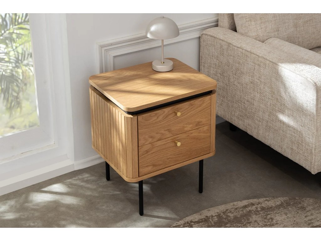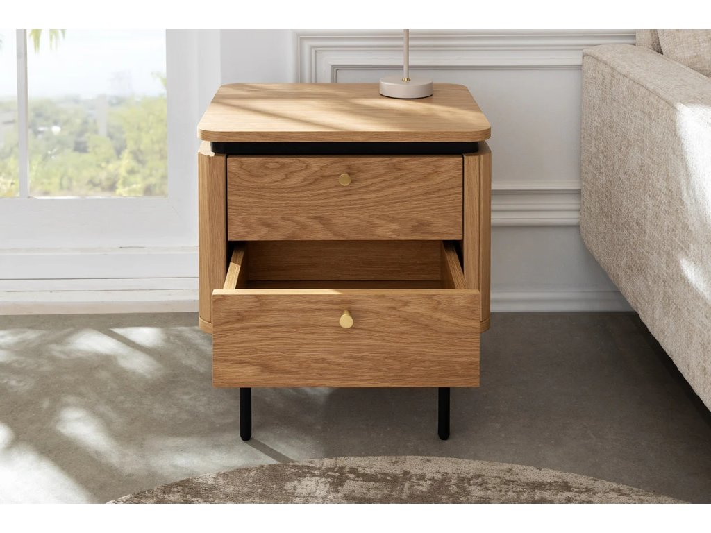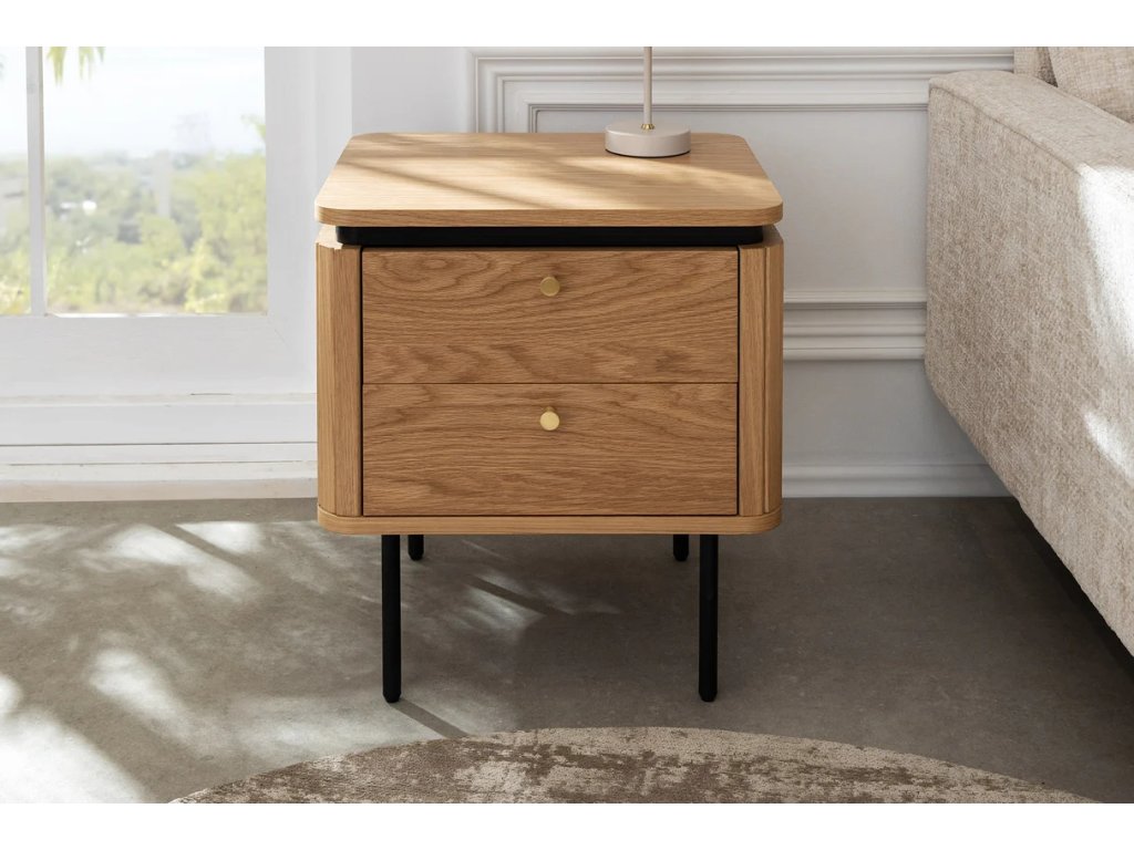 Designový noční stolek Luminia spojuje přirozenou eleganci dubového dekoru s moderní kombinací černého kovu a mosazných detailů. Díky svému nadčasovému designu se stane stylovým a zároveň praktickým doplňkem každé ložnice. Nabízí chytré úložné řešení pro vše, co chcete mít po ruce – od knihy až po drobné osobní předměty. Pevná konstrukce zajišťuje stabilitu a dlouhou životnost, zatímco kontrast přírodních a tmavých prvků dodává interiéru moderní charakter.