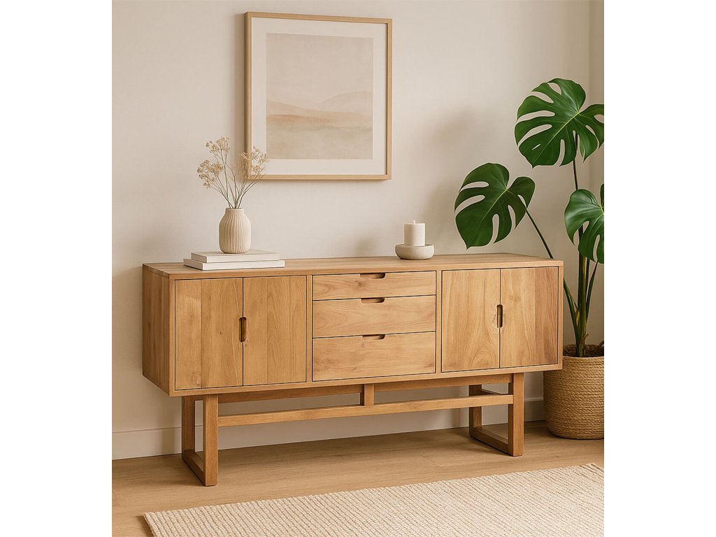 Příborník Tenerife je vyroben z masivního teakového dřeva a nabízí kombinaci funkčnosti a nadčasového designu. Díky třem zásuvkám a čtyřem dvířkům poskytuje dostatek úložného prostoru pro nádobí, textilie či jiné domácí vybavení. Každý kus je ručně vyrobený originál, takže se může mírně lišit odstínem a kresbou dřeva. Teakové dřevo je ceněno pro svou odolnost a dlouhou životnost, což zaručuje, že tento bufet bude sloužit po mnoho let. Nábytek se dodává v rozloženém stavu a vyžaduje jednoduchou montáž. Pro údržbu postačí pravidelné otírání suchým hadříkem.